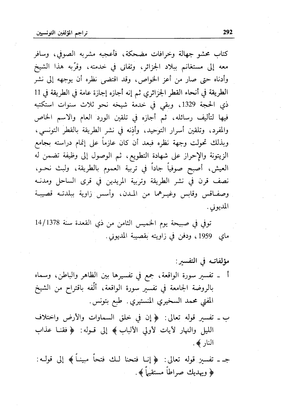 أ - تفسير سورة الواقعة، جمع في تفسيرها بين الظاهر والباطن، وسماه بالروضة الجامعة في تفسير سورة الواقعة، ألّفه باقتراح من الشيخ المفتي محمد السخيري المنستيري. طبع بتونس.