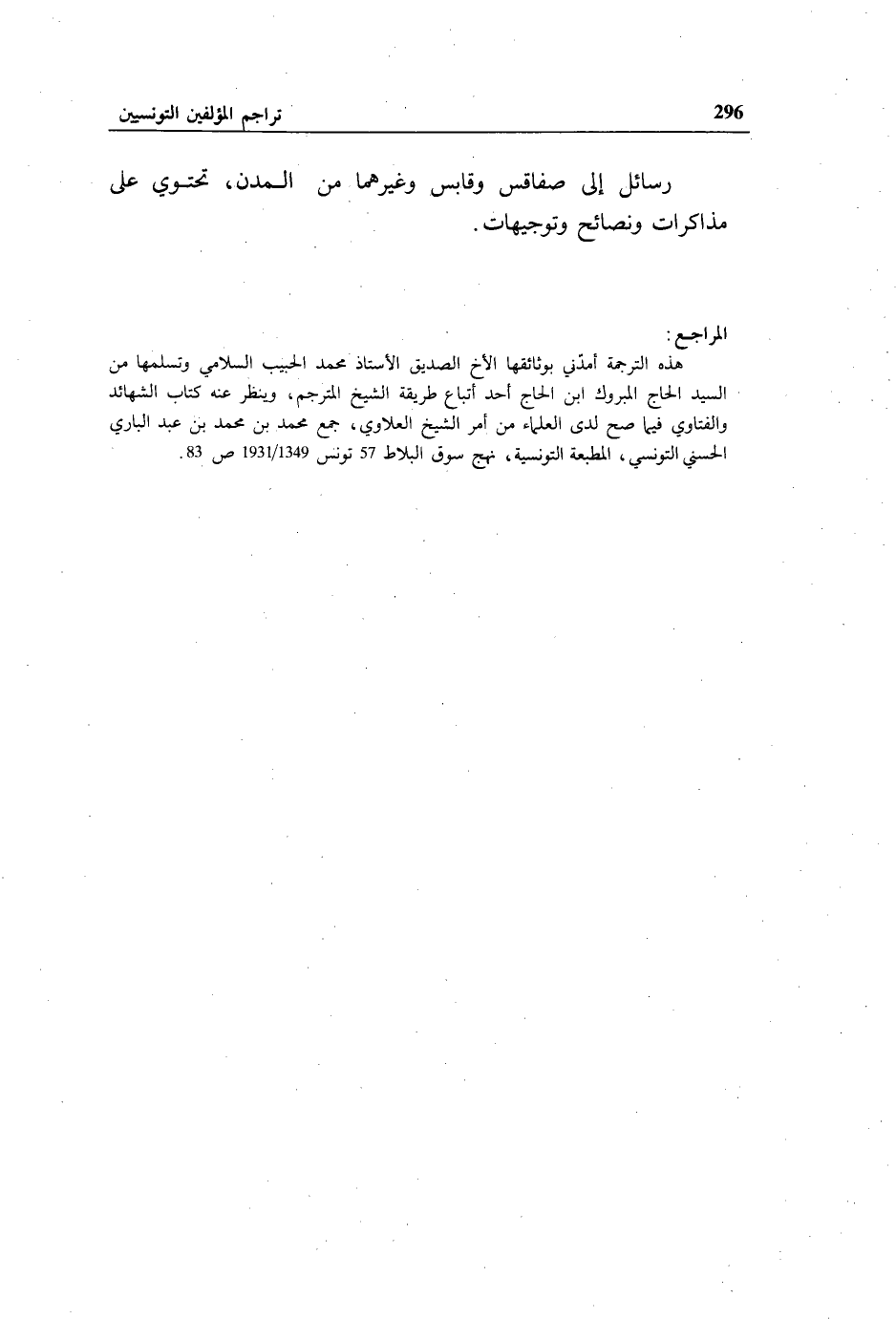 هذه الترجمة أمدّني بوثائقها الأخ الصديق الأستاذ محمد الحبيب السلامي وتسلمها من السيد الحاج المبروك ابن الحاج أحد أتباع طريقة الشيخ المترجم، وينظر عنه كتاب الشهائد والفتاوي فيما صح لدى العلماء من أمر الشيخ العلاوي، جمع محمد بن محمد بن عبد الباري الحسني التونسي، المطبعة التونسية، نهج سوق البلاط 57 تونس 1349/ 1931 ص 83.