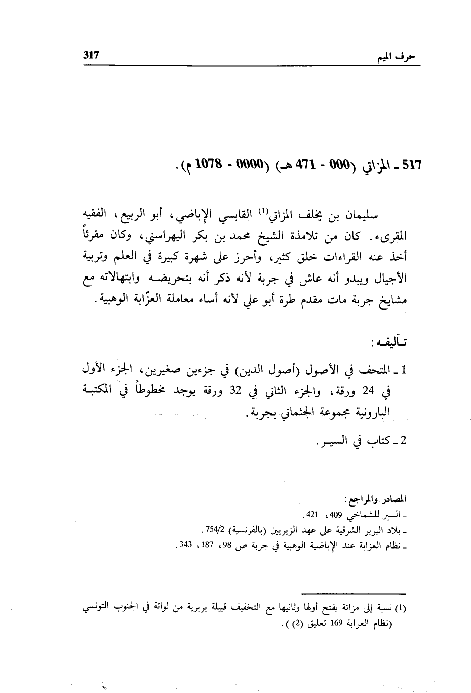 سليمان بن يخلف المزاتي (¬1) القابسي الإباضي، أبو الربيع، الفقيه المقرئ. كان من تلامذة الشيخ محمد بن بكر اليهراسني، وكان مقرئا أخذ عنه القراءات خلق كثير، وأحرز على شهرة كبيرة في العلم وتربية الأجيال ويبدو أنه عاش في جربة لأنه ذكر أنه بتحريضه وابتهالاته مع مشايخ جربة مات مقدم طرة أبو علي لأنه أساء معاملة العزّابة الوهبية.