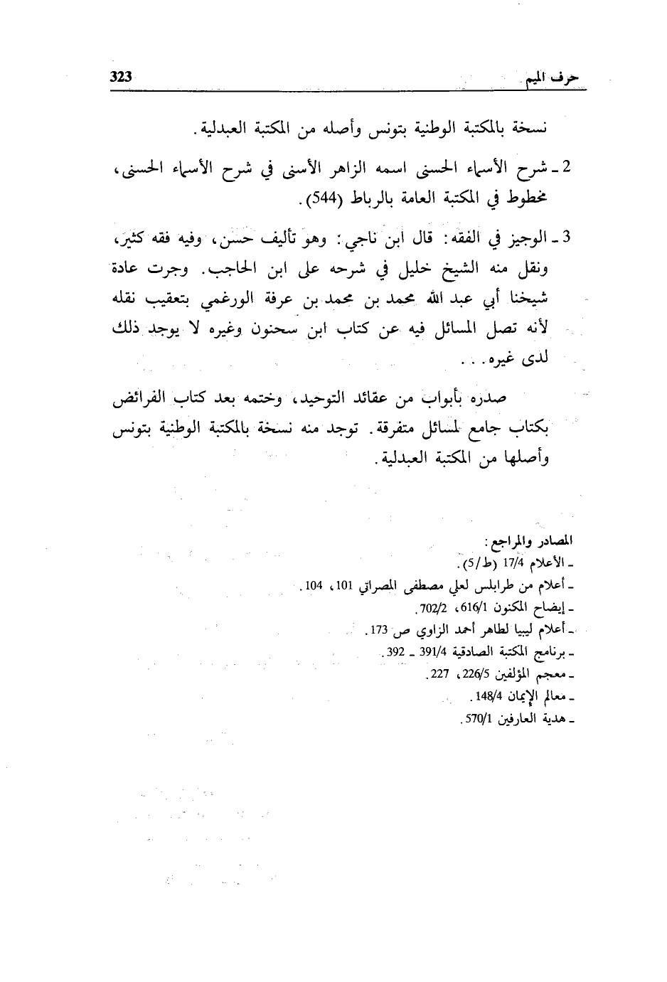 3 - الوجيز في الفقه: قال ابن ناجي: وهو تأليف حسن، وفيه فقه كثير، ونقل منه الشيخ خليل في شرحه على ابن الحاجب. وجرت عادة شيخنا أبي عبد الله محمد بن محمد بن عرفة الورغمي يتعقب نقله لأنه تصل المسائل فيه عن كتاب ابن سحنون وغيره لا يوجد ذلك لدى غيره