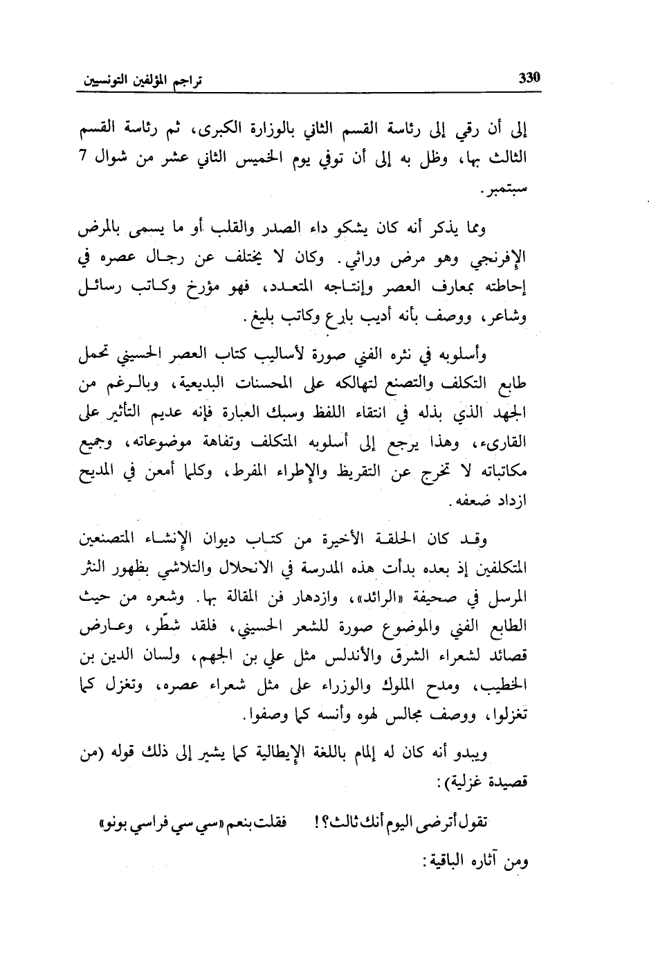 وقد كان الحلقة الأخيرة من كتاب ديوان الإنشاء المتصنعين المتكلفين إذ بعده بدأت هذه المدرسة في الانحلال والتلاشي بظهور النثر المرسل في صحيفة «الرائد»، وازدهار فن المقالة بها. وشعره من حيث الطابع الفني والموضوع صورة للشعر الحسيني، فلقد شطّر، وعارض قصائد لشعراء الشرق والأندلس مثل علي بن الجهم، ولسان الدين بن الخطيب، ومدح الملوك والوزراء على مثل شعراء عصره، وتغزل كما تغزلوا، ووصف مجالس لهوه وأنسه كما وصفوا.