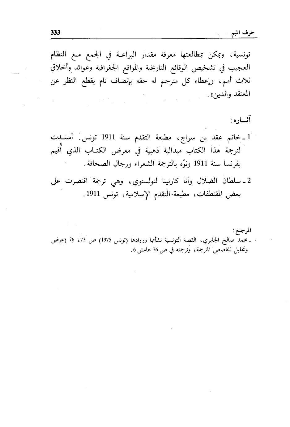 2 - سلطان الضلال وأنا كارنينا لتولستوي، وهي ترجمة اقتصرت على بعض المقتطفات، مطبعة التقدم الإسلامية، تونس 1911.