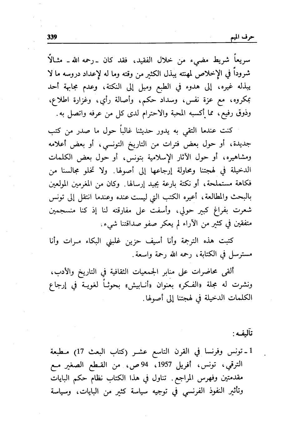 كنت عند ما التقي به يدور حديثنا غالبا حول ما صدر من كتب جديدة، أو حول بعض فترات من التاريخ التونسي، أو بعض أعلامه ومشاهيره، أو حول الآثار الإسلامية بتونس، أو حول بعض الكلمات الدخيلة في لهجتنا ومحاولة إرجاعها إلى أصولها. ولا تخلو مجالسنا من فكاهة مستملحة، أو نكتة بارعة يجيد إرسالها. وكان من المغرمين المولعين بالبحث والمطالعة، أعيره الكتب التي ليست عنده وعند ما انتقل إلى تونس شعرت بفراغ كبير حولي، وأسفت على مفارقته لنا إذ كنا منسجمين متفقين في كثير من الآراء لم يعكر صفو صداقتنا شيء.