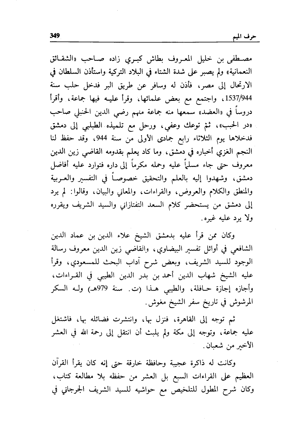 مصطفى بن خليل المعروف بطاش كبري زاده صاحب «الشقائق النعمانية» ولم يصبر على شدة الشتاء في البلاد التركية واستأذن السلطان في الارتحال إلى مصر، فأذن له وسافر عن طريق البر فدخل حلب سنة 944/ 1537، واجتمع مع بعض علمائها، وقرأ عليه فيها جماعة، وأقرأ دروسا في «العضد» سمعها منه جماعة منهم رضي الدين الحنبلي صاحب «در الحبب»، ثم توعك وعوفي، ورحل مع تلميذه الطبلبي إلى دمشق فدخلاها يوم الثلاثاء رابع جمادى الأولى من سنة 944، وقد حفظ لنا النجم الغزي أخباره في دمشق، وما كاد يعلم بقدومه القاضي زين الدين معروف حتى جاء مسلما عليه وحمله مكرما إلى داره فتوارد عليه أفاضل دمشق، وشهدوا له بالعلم والتحقيق خصوصا في التفسير والعربية والمنطق والكلام والعروض، والقراءات، والمعاني والبيان، وقالوا: لم يرد إلى دمشق من يستحضر كلام السعد التفتازاني والسيد الشريف ويقرره ولا يرد عليه غيره.