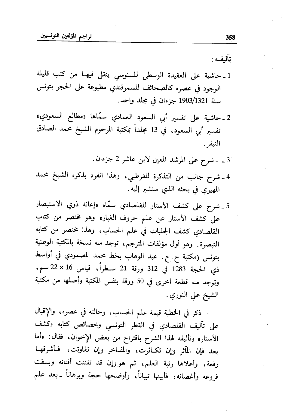 5 - شرح على كشف الأستار للقلصادي سمّاه «إعانة ذوي الاستبصار على كشف الأستار عن علم حروف الغبار» وهو مختصر من كتاب القلصادي كشف الجلبات في علم الحساب، وهذا مختصر من كتابه التبصرة. وهو أول مؤلفات المترجم، توجد منه نسخة بالمكتبة الوطنية بتونس (مكتبة ح. ح. عبد الوهاب بخط محمد المصمودي في أواسط ذي الحجة 1283 في 312 ورقة 21 سطرا، قياس 16 * 22 سم، وتوجد منه قطعة أخرى في 50 ورقة بنفس المكتبة وأصلها من مكتبة الشيخ علي النوري.