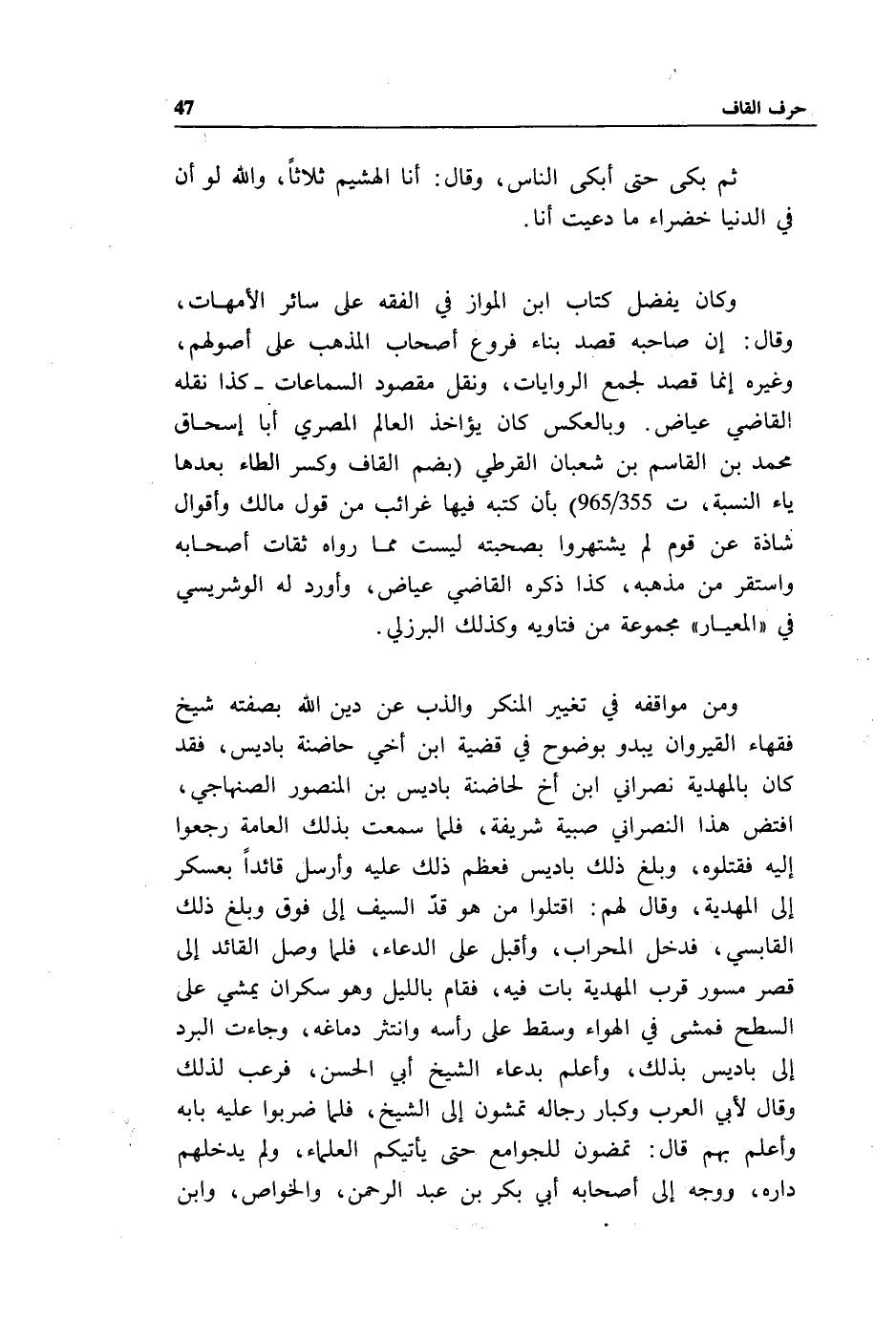 وكان يفضل كتاب ابن المواز في الفقه على سائر الأمهات، وقال: إن صاحبه قصد بناء فروع أصحاب المذهب على أصولهم، وغيره إنما قصد لجمع الروايات، ونقل مقصود السماعات - كذا نقله القاضي عياض. وبالعكس كان يؤاخذ العالم المصري أبا إسحاق محمد بن القاسم بن شعبان القرطي (بضم القاف وكسر الطاء بعدها ياء النسبة، ت 355/ 965) بأن كتبه فيها غرائب من قول مالك وأقوال شاذة عن قوم لم يشتهروا بصحبته ليست مما رواه ثقات أصحابه واستقر من مذهبه، كذا ذكره القاضي عياض، وأورد له الوشريسي في «المعيار» مجموعة من فتاويه وكذلك البرزلي.