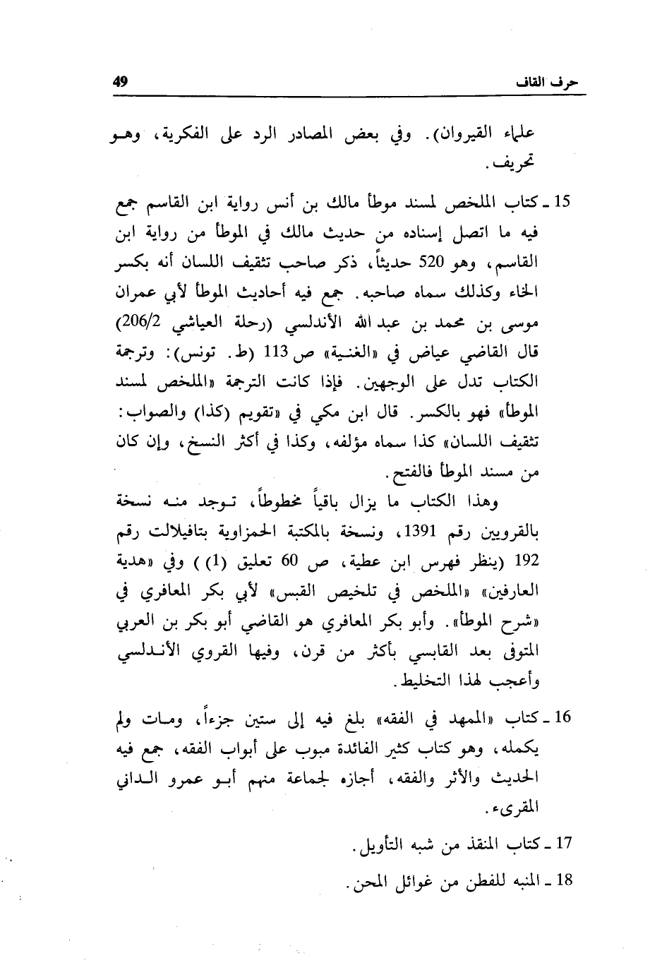 15 - كتاب الملخص لمسند موطأ مالك بن أنس رواية ابن القاسم جمع فيه ما اتصل إسناده من حديث مالك في الموطأ من رواية ابن القاسم، وهو 520 حديثا، ذكر صاحب تثقيف اللسان أنه بكسر الخاء وكذلك سماه صاحبه. جمع فيه أحاديث الموطأ لأبي عمران موسى بن محمد بن عبد الله الأندلسي (رحلة العياشي 2/ 206) قال القاضي عياض في «الغنية» ص 113 (ط. تونس): وترجمة الكتاب تدل على الوجهين. فإذا كانت الترجمة «الملخص لمسند الموطأ» فهو بالكسر. قال ابن مكي في «تقويم (كذا) والصواب: