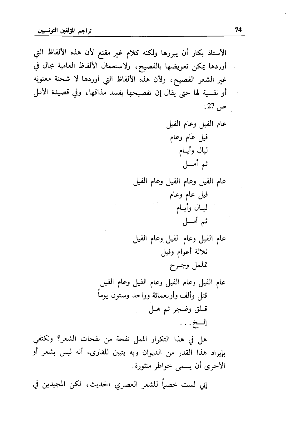 الأستاذ بكار أن يبررها ولكنه كلام غير مقنع لأن هذه الألفاظ التي أوردها يمكن تعويضها بالفصيح، ولاستعمال الألفاظ العامية مجال في غير الشعر الفصيح، ولأن هذه الألفاظ التي أوردها لا شحنة معنوية أو نفسية لها حتى يقال إن تفصيحها يفسد مذاقها، وفي قصيدة الأمل ص 27: