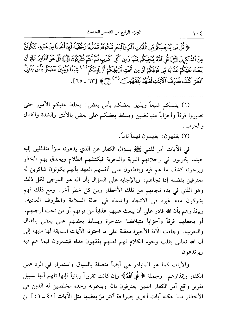 وبإنذارهم بأن الله قادر على أن يبعث عليهم عذابا من فوقهم أو من تحت أرجلهم، أو يجعلهم فرقا وأحزابا متباغضة متناحرة ويسلط بعضهم على بعض بالقتال والحرب. وجاءت الآية الأخيرة معقبة على ما احتوته الآيات السابقة لها منبهة إلى أن الله تعالى يقلب وجوه الكلام لهم لعلهم يفقهون مداه فيتدبرون فيما هم فيه ويرتدعون.