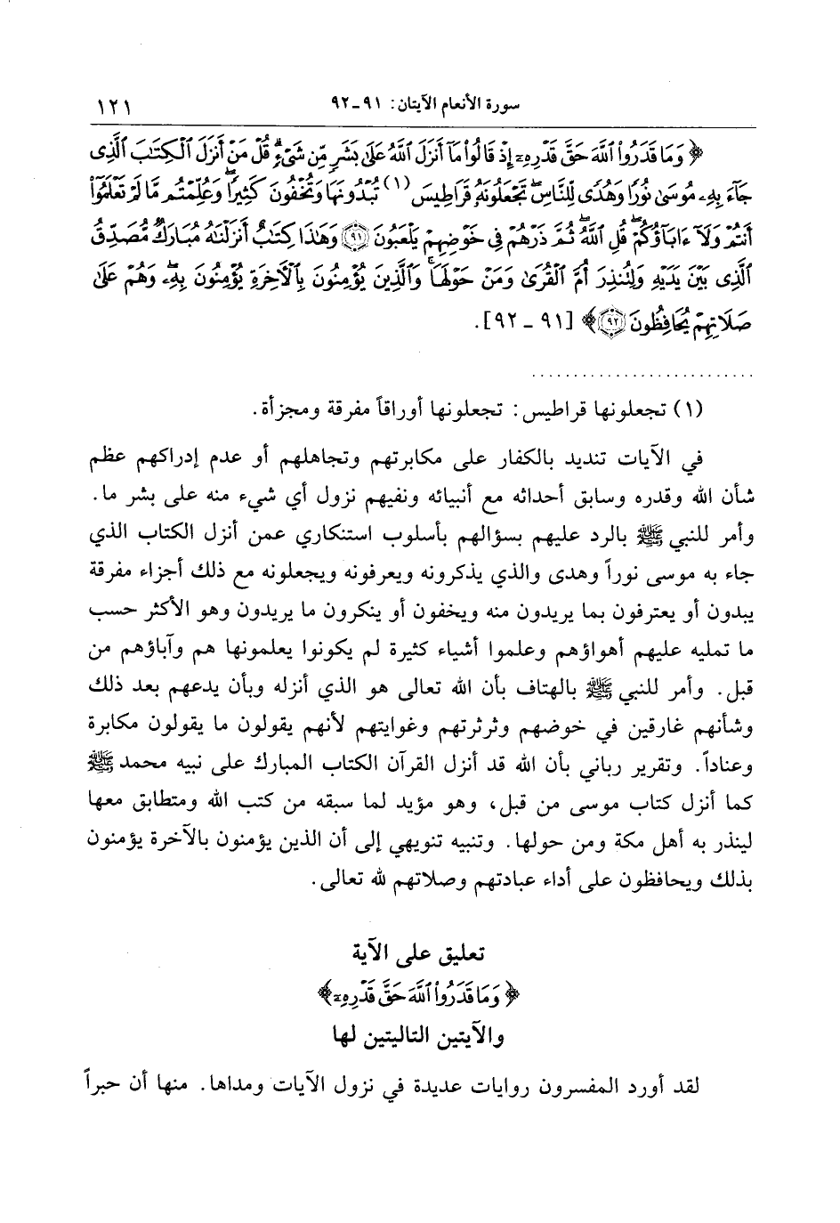 وَما قَدَرُوا اللَّهَ حَقَّ قَدْرِهِ إِذْ قالُوا ما أَنْزَلَ اللَّهُ عَلى بَشَرٍ مِنْ شَيْءٍ قُلْ مَنْ أَنْزَلَ الْكِتابَ الَّذِي جاءَ بِهِ مُوسى نُوراً وَهُدىً لِلنَّاسِ تَجْعَلُونَهُ قَراطِيسَ تُبْدُونَها وَتُخْفُونَ كَثِيراً وَعُلِّمْتُمْ ما لَمْ تَعْلَمُوا أَنْتُمْ وَلا آباؤُكُمْ قُلِ اللَّهُ ثُمَّ ذَرْهُمْ فِي خَوْضِهِمْ يَلْعَبُونَ (91) وَهذا كِتابٌ أَنْزَلْناهُ مُبارَكٌ مُصَدِّقُ الَّذِي بَيْنَ يَدَيْهِ وَلِتُنْذِرَ أُمَّ الْقُرى وَمَنْ حَوْلَها وَالَّذِينَ يُؤْمِنُونَ بِالْآخِرَةِ يُؤْمِنُونَ بِهِ وَهُمْ عَلى صَلاتِهِمْ يُحافِظُونَ (92)