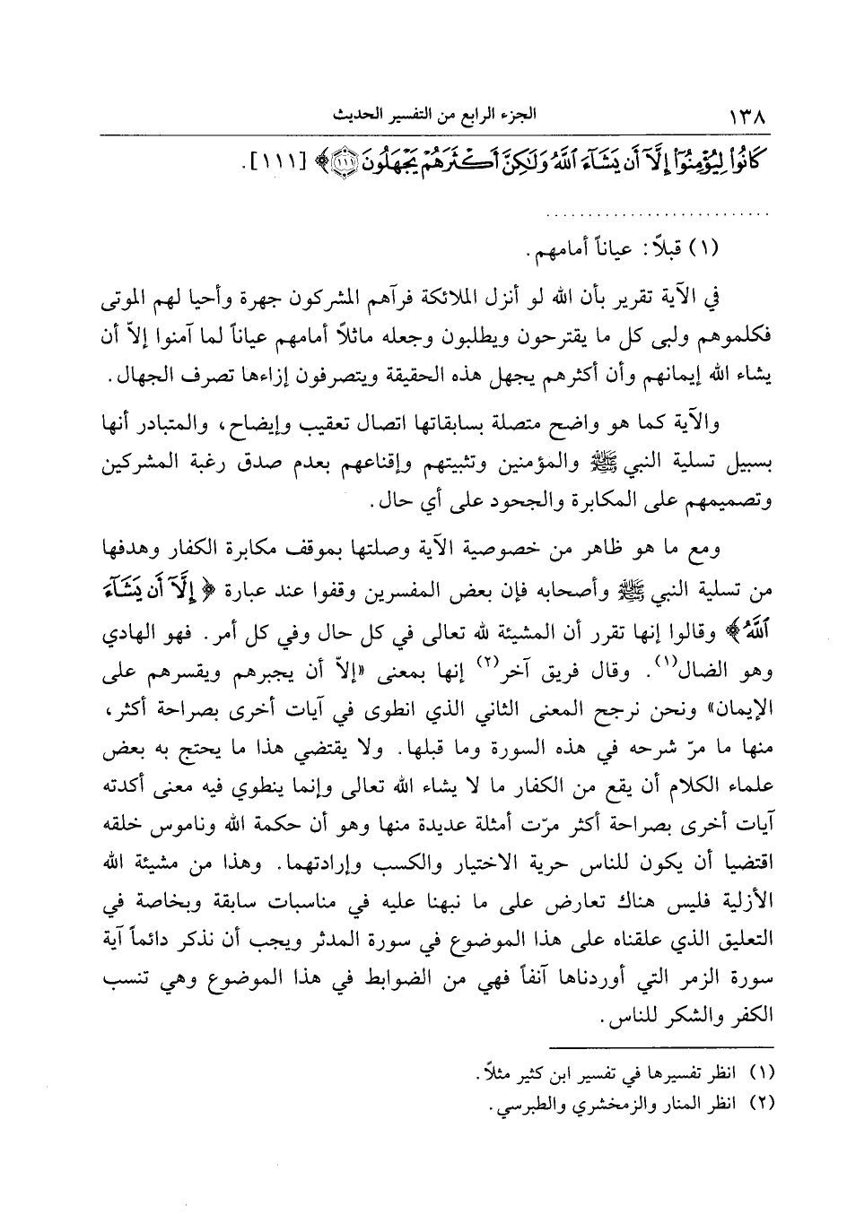 ومع ما هو ظاهر من خصوصية الآية وصلتها بموقف مكابرة الكفار وهدفها من تسلية النبي صلى الله عليه وسلم وأصحابه فإن بعض المفسرين وقفوا عند عبارة إِلَّا أَنْ يَشاءَ اللَّهُ وقالوا إنها تقرر أن المشيئة لله تعالى في كل حال وفي كل أمر. فهو الهادي وهو الضال «1» . وقال فريق آخر «2» إنها بمعنى «إلّا أن يجبرهم ويقسرهم على الإيمان» ونحن نرجح المعنى الثاني الذي انطوى في آيات أخرى بصراحة أكثر، منها ما مرّ شرحه في هذه السورة وما قبلها. ولا يقتضي هذا ما يحتج به بعض علماء الكلام أن يقع من الكفار ما لا يشاء الله تعالى وإنما ينطوي فيه معنى أكدته آيات أخرى بصراحة أكثر مرّت أمثلة عديدة منها وهو أن حكمة الله وناموس خلقه اقتضيا أن يكون للناس حرية الاختيار والكسب وإرادتهما. وهذا من مشيئة الله الأزلية فليس هناك تعارض على ما نبهنا عليه في مناسبات سابقة وبخاصة في التعليق الذي علقناه على هذا الموضوع في سورة المدثر ويجب أن نذكر دائما آية سورة الزمر التي أوردناها آنفا فهي من الضوابط في هذا الموضوع وهي تنسب الكفر والشكر للناس.