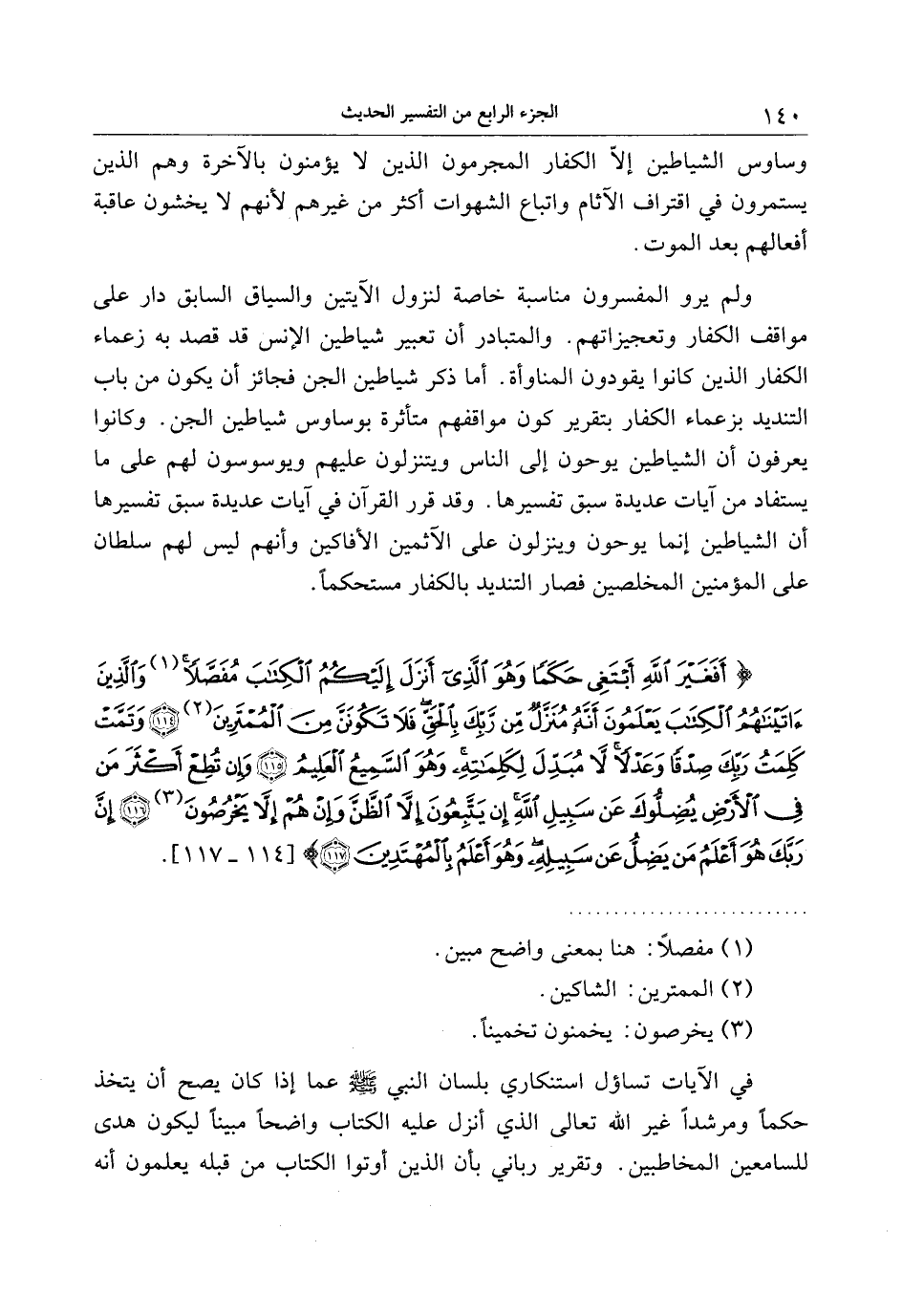 أَفَغَيْرَ اللَّهِ أَبْتَغِي حَكَماً وَهُوَ الَّذِي أَنْزَلَ إِلَيْكُمُ الْكِتابَ مُفَصَّلاً وَالَّذِينَ آتَيْناهُمُ الْكِتابَ يَعْلَمُونَ أَنَّهُ مُنَزَّلٌ مِنْ رَبِّكَ بِالْحَقِّ فَلا تَكُونَنَّ مِنَ الْمُمْتَرِينَ (114) وَتَمَّتْ كَلِمَةُ رَبِّكَ صِدْقاً وَعَدْلاً لا مُبَدِّلَ لِكَلِماتِهِ وَهُوَ السَّمِيعُ الْعَلِيمُ (115) وَإِنْ تُطِعْ أَكْثَرَ مَنْ فِي الْأَرْضِ يُضِلُّوكَ عَنْ سَبِيلِ اللَّهِ إِنْ يَتَّبِعُونَ إِلاَّ الظَّنَّ وَإِنْ هُمْ إِلاَّ يَخْرُصُونَ (116) إِنَّ رَبَّكَ هُوَ أَعْلَمُ مَنْ يَضِلُّ عَنْ سَبِيلِهِ وَهُوَ أَعْلَمُ بِالْمُهْتَدِينَ (117)