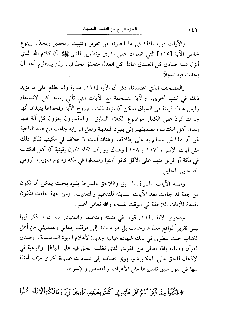 والمصحف الذي اعتمدناه ذكر أن الآية [114] مدينة ولم نطلع على ما يؤيد ذلك في كتب أخرى. والآية منسجمة مع الآيات التي تأتي بعدها كل الانسجام وليس هناك قرينة في السياق يمكن أن يؤيد ذلك. وروح الآية وفحواها يفيدان أنها جاءت كردّ على الكفار موضوع الكلام السابق. والمفسرون يعزون كل آية فيها إيمان أهل الكتاب وتصديقهم إلى يهود المدينة ولعل الرواية جاءت من هذه الناحية غير أن هذا غير مسلم به على إطلاقه، وهناك آيات لا خلاف في مكيتها تذكر ذلك مثل آيات الإسراء [107 و 108] وهناك روايات تكاد تكون يقينية أن أهل الكتاب في مكة أو فريق منهم على الأقل كانوا آمنوا وصدقوا في مكة ومنهم صهيب الرومي الصحابي الجليل.
