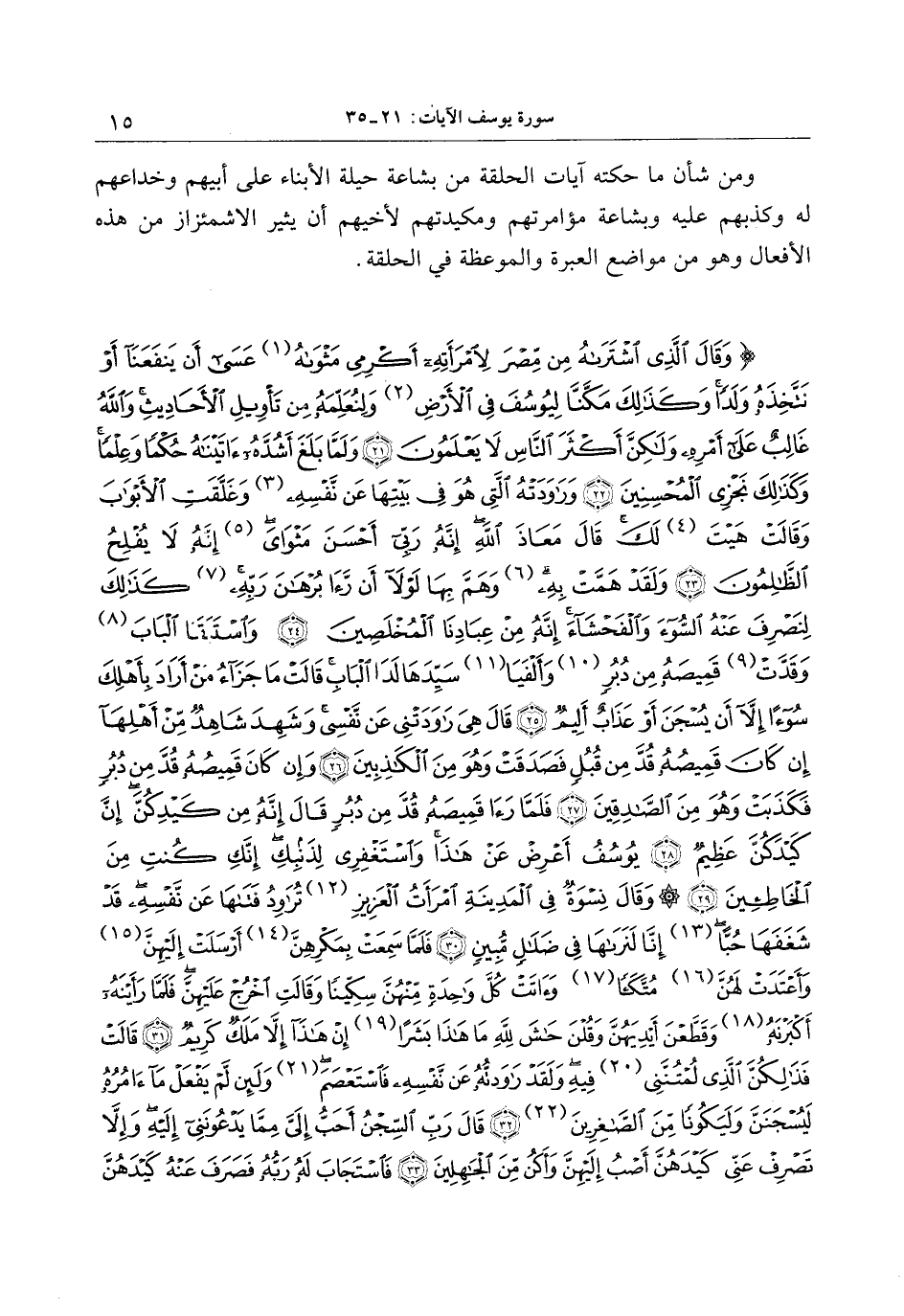 وَقالَ الَّذِي اشْتَراهُ مِنْ مِصْرَ لامْرَأَتِهِ أَكْرِمِي مَثْواهُ عَسى أَنْ يَنْفَعَنا أَوْ نَتَّخِذَهُ وَلَداً وَكَذلِكَ مَكَّنَّا لِيُوسُفَ فِي الْأَرْضِ وَلِنُعَلِّمَهُ مِنْ تَأْوِيلِ الْأَحادِيثِ وَاللَّهُ غالِبٌ عَلى أَمْرِهِ وَلكِنَّ أَكْثَرَ النَّاسِ لا يَعْلَمُونَ (21) وَلَمَّا بَلَغَ أَشُدَّهُ آتَيْناهُ حُكْماً وَعِلْماً وَكَذلِكَ نَجْزِي الْمُحْسِنِينَ (22) وَراوَدَتْهُ الَّتِي هُوَ فِي بَيْتِها عَنْ نَفْسِهِ وَغَلَّقَتِ الْأَبْوابَ وَقالَتْ هَيْتَ لَكَ قالَ مَعاذَ اللَّهِ إِنَّهُ رَبِّي أَحْسَنَ مَثْوايَ إِنَّهُ لا يُفْلِحُ الظَّالِمُونَ (23) وَلَقَدْ هَمَّتْ بِهِ وَهَمَّ بِها لَوْلا أَنْ رَأى بُرْهانَ رَبِّهِ كَذلِكَ لِنَصْرِفَ عَنْهُ السُّوءَ وَالْفَحْشاءَ إِنَّهُ مِنْ عِبادِنَا الْمُخْلَصِينَ (24) وَاسْتَبَقَا الْبابَ وَقَدَّتْ قَمِيصَهُ مِنْ دُبُرٍ وَأَلْفَيا سَيِّدَها لَدَى الْبابِ قالَتْ ما جَزاءُ مَنْ أَرادَ بِأَهْلِكَ سُوءاً إِلاَّ أَنْ يُسْجَنَ أَوْ عَذابٌ أَلِيمٌ (25)