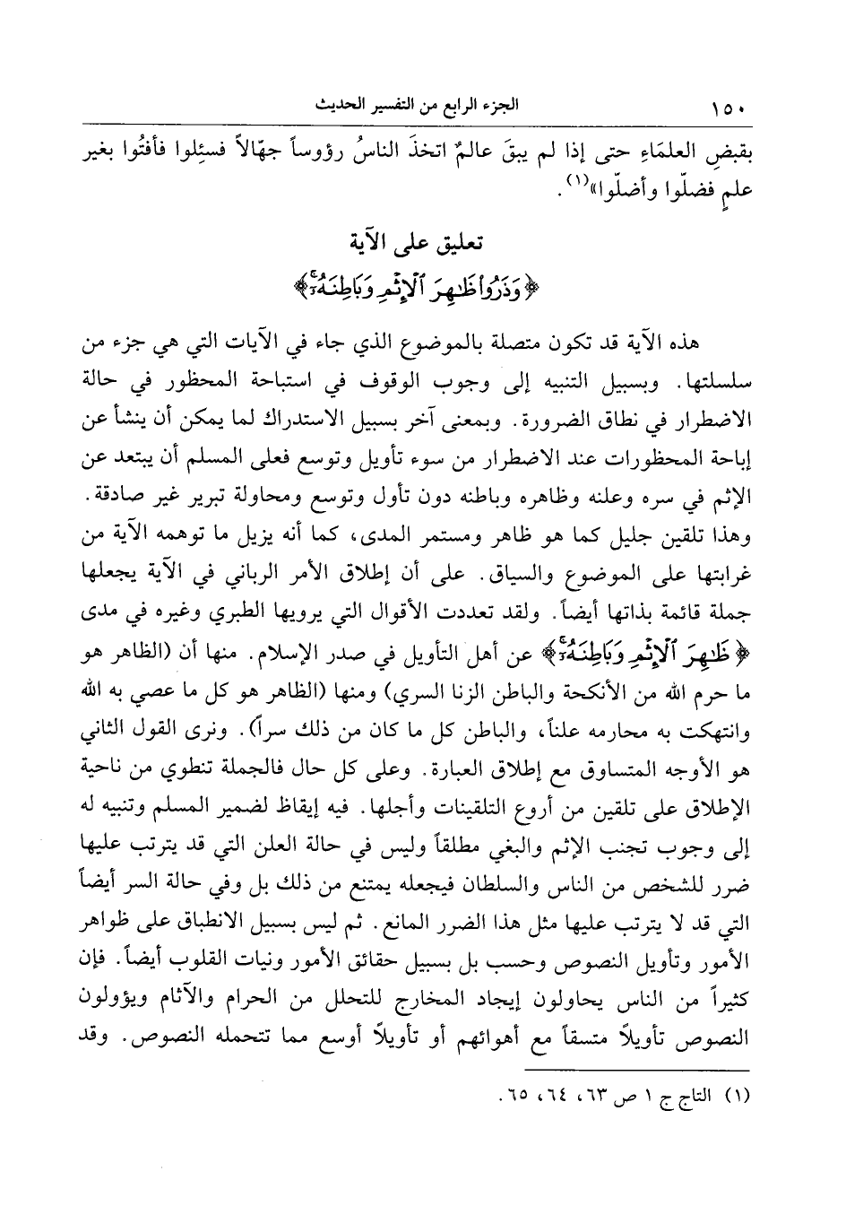 وهذا تلقين جليل كما هو ظاهر ومستمر المدى، كما أنه يزيل ما توهمه الآية من غرابتها على الموضوع والسياق. على أن إطلاق الأمر الرباني في الآية يجعلها جملة قائمة بذاتها أيضا. ولقد تعددت الأقوال التي يرويها الطبري وغيره في مدى ظاهِرَ الْإِثْمِ وَباطِنَهُ عن أهل التأويل في صدر الإسلام. منها أن (الظاهر هو ما حرم الله من الأنكحة والباطن الزنا السري) ومنها (الظاهر هو كل ما عصي به الله وانتهكت به محارمه علنا، والباطن كل ما كان من ذلك سرا) . ونرى القول الثاني هو الأوجه المتساوق مع إطلاق العبارة. وعلى كل حال فالجملة تنطوي من ناحية الإطلاق على تلقين من أروع التلقينات وأجلها. فيه إيقاظ لضمير المسلم وتنبيه له إلى وجوب تجنب الإثم والبغي مطلقا وليس في حالة العلن التي قد يترتب عليها ضرر للشخص من الناس والسلطان فيجعله يمتنع من ذلك بل وفي حالة السر أيضا التي قد لا يترتب عليها مثل هذا الضرر المانع. ثم ليس بسبيل الانطباق على ظواهر الأمور وتأويل النصوص وحسب بل بسبيل حقائق الأمور ونيات القلوب أيضا. فإن كثيرا من الناس يحاولون إيجاد المخارج للتحلل من الحرام والآثام ويؤولون النصوص تأويلا متسقا مع أهوائهم أو تأويلا أوسع مما تتحمله النصوص. وقد