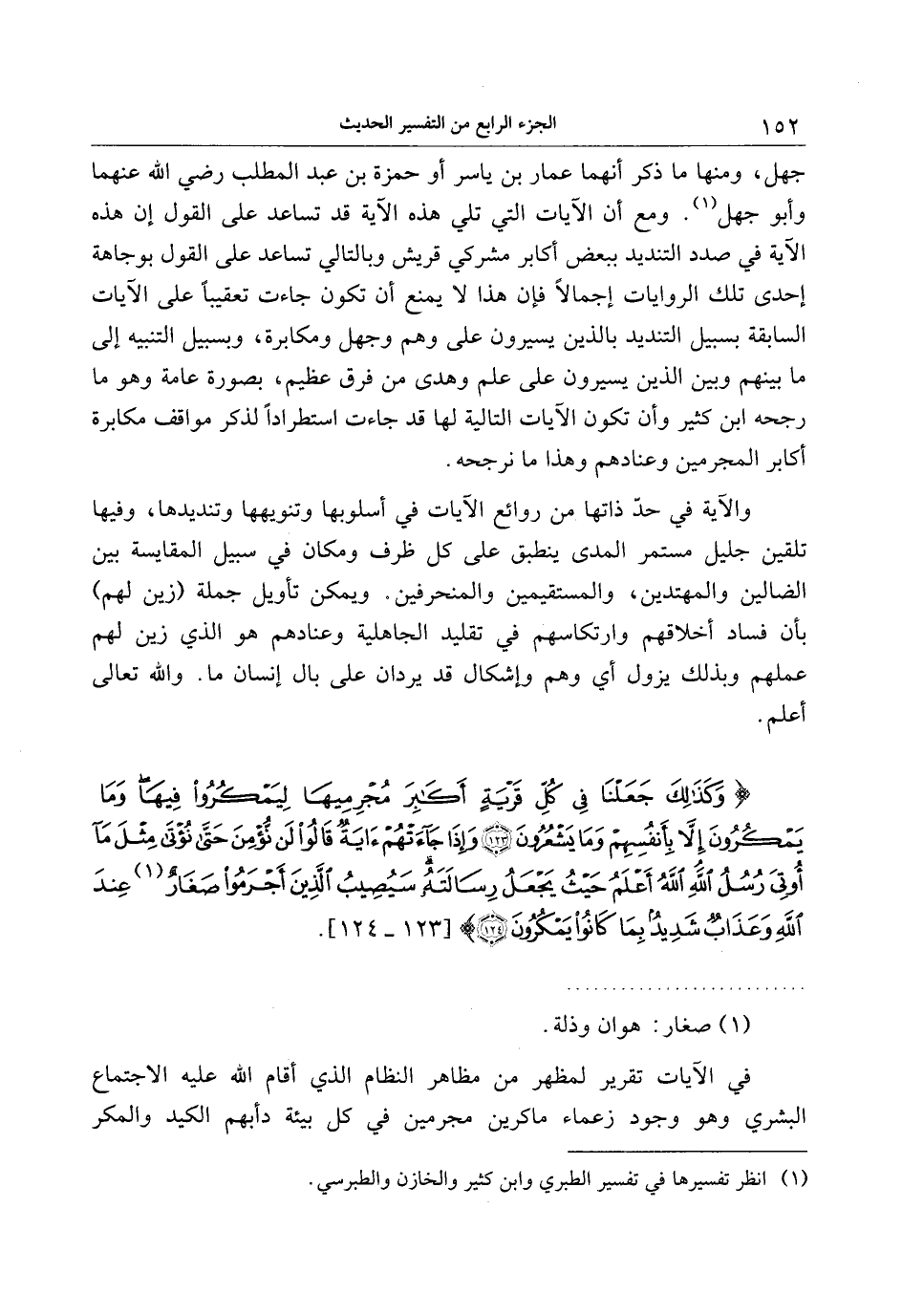 وَكَذلِكَ جَعَلْنا فِي كُلِّ قَرْيَةٍ أَكابِرَ مُجْرِمِيها لِيَمْكُرُوا فِيها وَما يَمْكُرُونَ إِلاَّ بِأَنْفُسِهِمْ وَما يَشْعُرُونَ (123) وَإِذا جاءَتْهُمْ آيَةٌ قالُوا لَنْ نُؤْمِنَ حَتَّى نُؤْتى مِثْلَ ما أُوتِيَ رُسُلُ اللَّهِ اللَّهُ أَعْلَمُ حَيْثُ يَجْعَلُ رِسالَتَهُ سَيُصِيبُ الَّذِينَ أَجْرَمُوا صَغارٌ عِنْدَ اللَّهِ وَعَذابٌ شَدِيدٌ بِما كانُوا يَمْكُرُونَ (124)