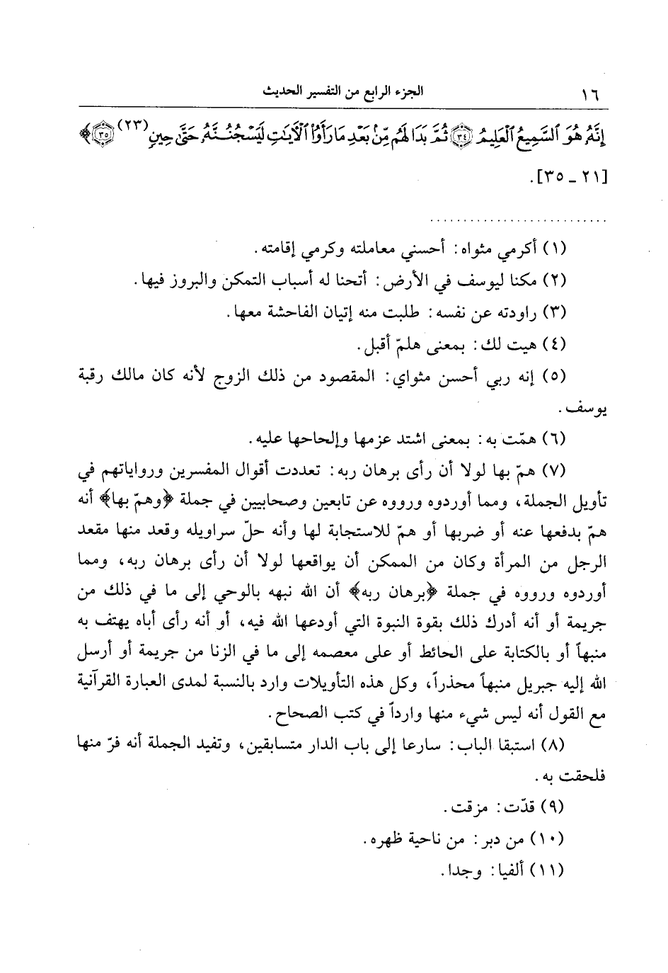 (7) همّ بها لولا أن رأى برهان ربه: تعددت أقوال المفسرين ورواياتهم في تأويل الجملة، ومما أوردوه ورووه عن تابعين وصحابيين في جملة وَهَمَّ بِها أنه همّ بدفعها عنه أو ضربها أو همّ للاستجابة لها وأنه حلّ سراويله وقعد منها مقعد الرجل من المرأة وكان من الممكن أن يواقعها لولا أن رأى برهان ربه، ومما أوردوه ورووه في جملة بُرْهانَ رَبِّهِ أن الله نبهه بالوحي إلى ما في ذلك من جريمة أو أنه أدرك ذلك بقوة النبوة التي أودعها الله فيه، أو أنه رأى أباه يهتف به منبها أو بالكتابة على الحائط أو على معصمه إلى ما في الزنا من جريمة أو أرسل الله إليه جبريل منبها محذرا، وكل هذه التأويلات وارد بالنسبة لمدى العبارة القرآنية مع القول أنه ليس شيء منها واردا في كتب الصحاح.