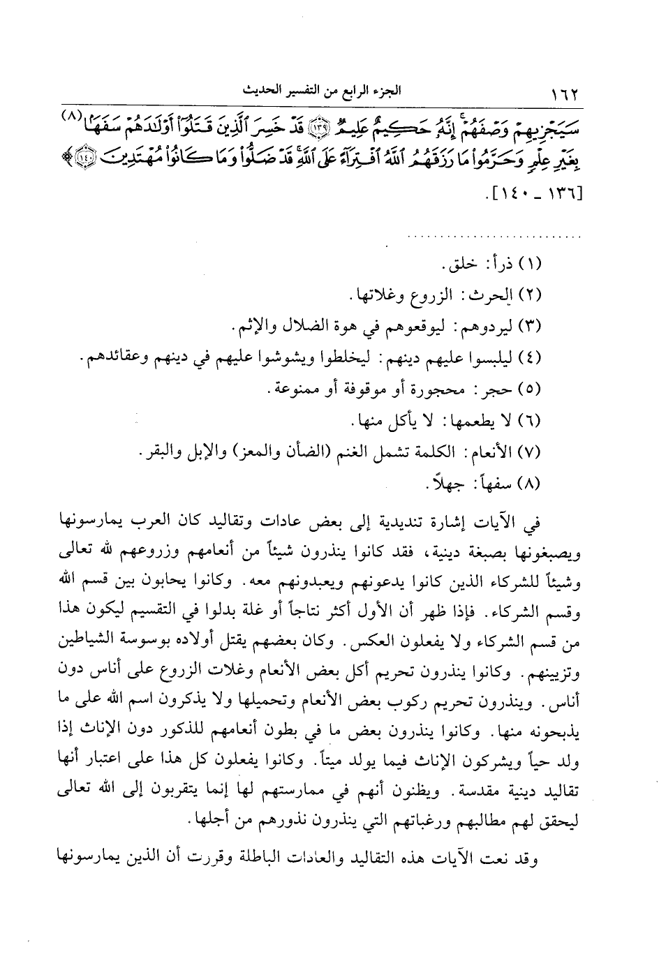 في الآيات إشارة تنديدية إلى بعض عادات وتقاليد كان العرب يمارسونها ويصبغونها بصبغة دينية، فقد كانوا ينذرون شيئا من أنعامهم وزروعهم لله تعالى وشيئا للشركاء الذين كانوا يدعونهم ويعبدونهم معه. وكانوا يحابون بين قسم الله وقسم الشركاء. فإذا ظهر أن الأول أكثر نتاجا أو غلة بدلوا في التقسيم ليكون هذا من قسم الشركاء ولا يفعلون العكس. وكان بعضهم يقتل أولاده بوسوسة الشياطين وتزيينهم. وكانوا ينذرون تحريم أكل بعض الأنعام وغلات الزروع على أناس دون أناس. وينذرون تحريم ركوب بعض الأنعام وتحميلها ولا يذكرون اسم الله على ما يذبحونه منها. وكانوا ينذرون بعض ما في بطون أنعامهم للذكور دون الإناث إذا ولد حيا ويشركون الإناث فيما يولد ميتا. وكانوا يفعلون كل هذا على اعتبار أنها تقاليد دينية مقدسة. ويظنون أنهم في ممارستهم لها إنما يتقربون إلى الله تعالى ليحقق لهم مطالبهم ورغباتهم التي ينذرون نذورهم من أجلها.