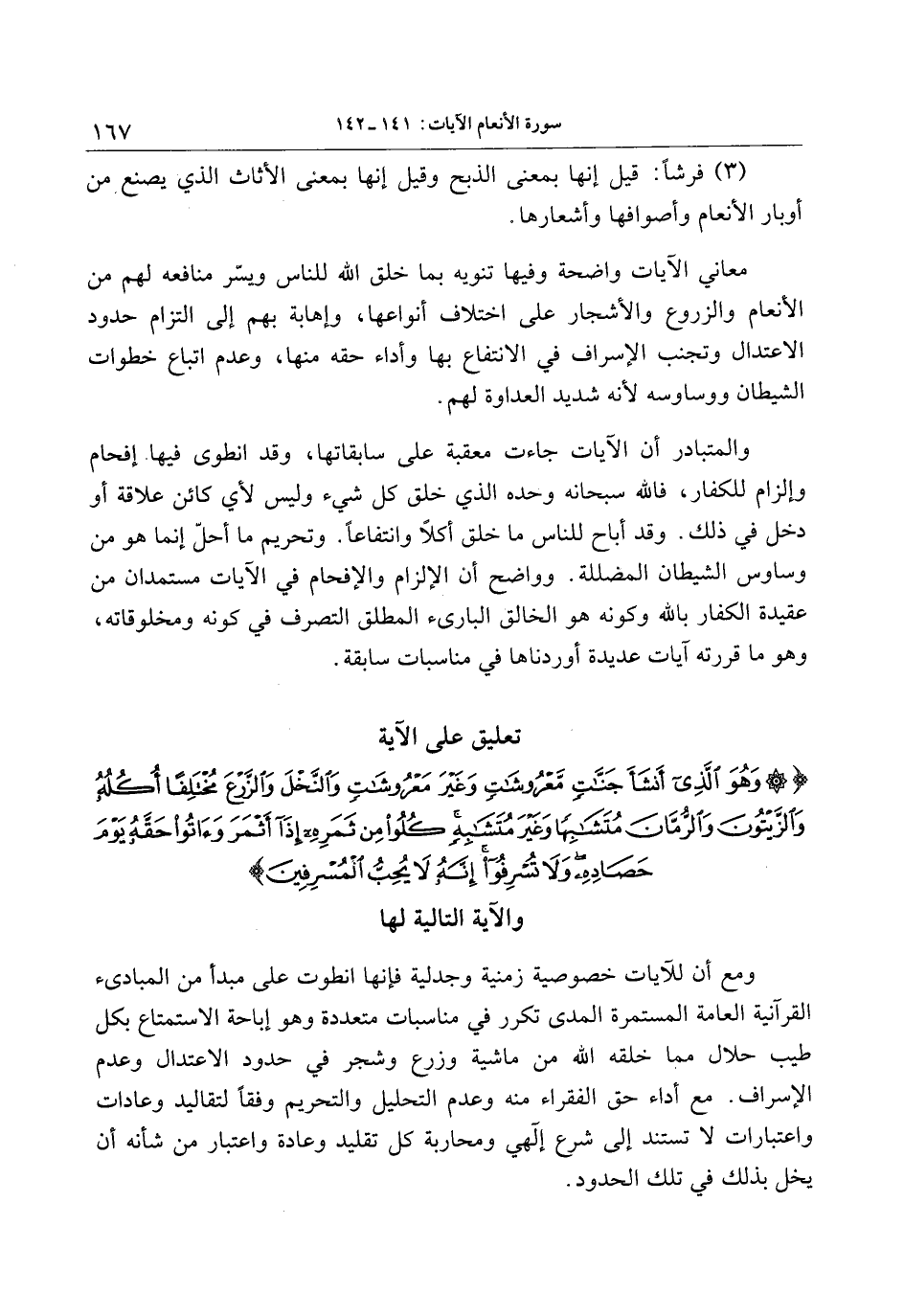 تعليق على الآية وَهُوَ الَّذِي أَنْشَأَ جَنَّاتٍ مَعْرُوشاتٍ وَغَيْرَ مَعْرُوشاتٍ وَالنَّخْلَ وَالزَّرْعَ مُخْتَلِفاً أُكُلُهُ وَالزَّيْتُونَ وَالرُّمَّانَ مُتَشابِهاً وَغَيْرَ مُتَشابِهٍ كُلُوا مِنْ ثَمَرِهِ إِذا أَثْمَرَ وَآتُوا حَقَّهُ يَوْمَ حَصادِهِ وَلا تُسْرِفُوا إِنَّهُ لا يُحِبُّ الْمُسْرِفِينَ والآية التالية لها