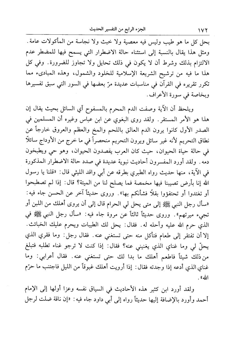ويلحظ أن الآية وصفت الدم المحرم بالمسفوح أي السائل بحيث يقال إن هذا هو الأمر المستقر. ولقد روى البغوي عن ابن عباس وغيره أن المسلمين في الصدر الأول كانوا يرون الدم العالق باللحم والمخ والعظم والعروق خارجا عن نطاق التحريم لأنه غير سائل ويرون التحريم منحصرا في ما خرج من الأوداج سائلا في حالة حياة الحيوان، حيث كان العرب يفصدون الحيوان، وهو حي ويطبخون دمه. ولقد أورد المفسرون أحاديث نبوية عديدة في صدد حالة الاضطرار المذكورة في الآية، منها حديث رواه الطبري بطرقه عن أبي واقد الليثي قال: «قلنا يا رسول الله إنا بأرض تصيبنا فيها مخمصة فما يصلح لنا من الميتة؟ قال: إذا لم تصطبحوا أو تغتدوا أو تحتفؤوا بقلا فشأنكم بها» . وروى حديثا آخر عن الحسن جاء فيه: