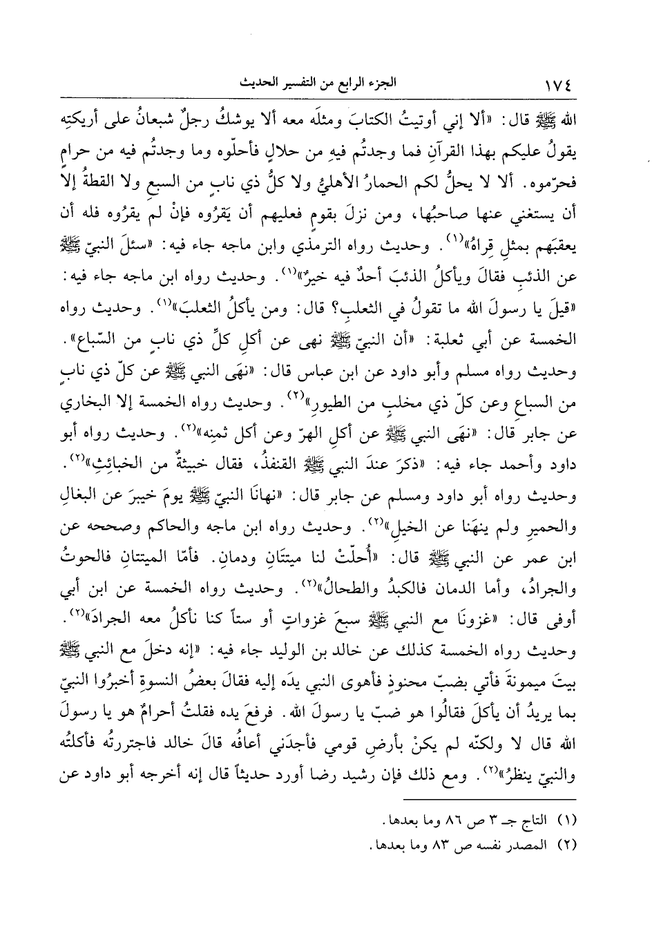 الله صلى الله عليه وسلم قال: «ألا إني أوتيت الكتاب ومثله معه ألا يوشك رجل شبعان على أريكته يقول عليكم بهذا القرآن فما وجدتم فيه من حلال فأحلّوه وما وجدتم فيه من حرام فحرّموه. ألا لا يحلّ لكم الحمار الأهليّ ولا كلّ ذي ناب من السبع ولا القطة إلا أن يستغني عنها صاحبها، ومن نزل بقوم فعليهم أن يقروه فإن لم يقروه فله أن يعقبهم بمثل قراه» «1» . وحديث رواه الترمذي وابن ماجه جاء فيه: «سئل النبيّ صلى الله عليه وسلم عن الذئب فقال ويأكل الذئب أحد فيه خير» «2» . وحديث رواه ابن ماجه جاء فيه: