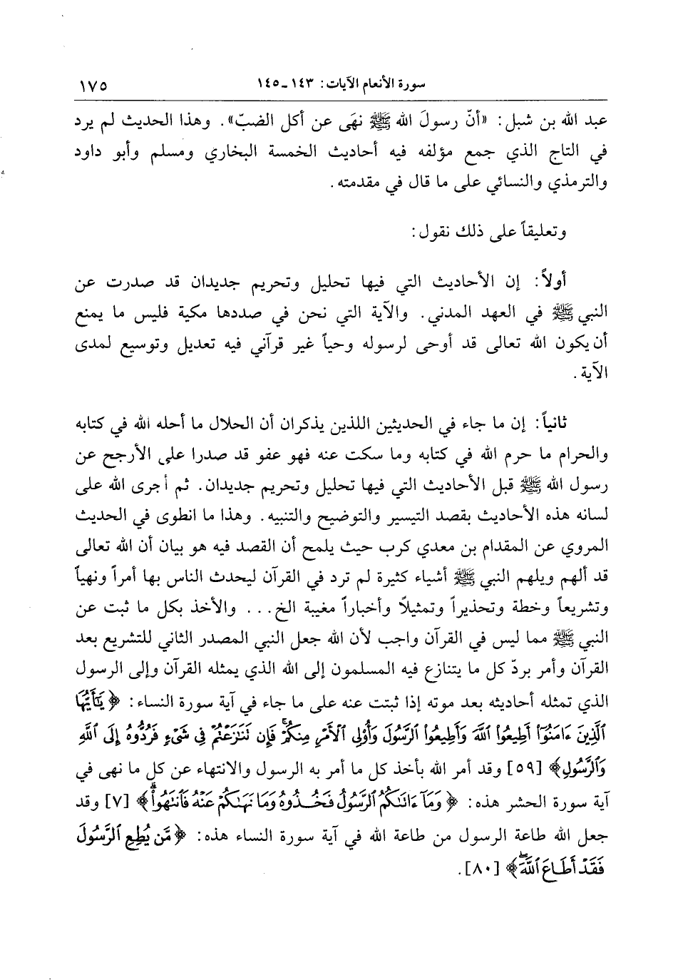 ثانيا: إن ما جاء في الحديثين اللذين يذكران أن الحلال ما أحله الله في كتابه والحرام ما حرم الله في كتابه وما سكت عنه فهو عفو قد صدرا على الأرجح عن رسول الله صلى الله عليه وسلم قبل الأحاديث التي فيها تحليل وتحريم جديدان. ثم أجرى الله على لسانه هذه الأحاديث بقصد التيسير والتوضيح والتنبيه. وهذا ما انطوى في الحديث المروي عن المقدام بن معدي كرب حيث يلمح أن القصد فيه هو بيان أن الله تعالى قد ألهم ويلهم النبي صلى الله عليه وسلم أشياء كثيرة لم ترد في القرآن ليحدث الناس بها أمرا ونهيا وتشريعا وخطة وتحذيرا وتمثيلا وأخبارا مغيبة إلخ ... والأخذ بكل ما ثبت عن النبي صلى الله عليه وسلم مما ليس في القرآن واجب لأن الله جعل النبي المصدر الثاني للتشريع بعد القرآن وأمر بردّ كل ما يتنازع فيه المسلمون إلى الله الذي يمثله القرآن وإلى الرسول الذي تمثله أحاديثه بعد موته إذا ثبتت عنه على ما جاء في آية سورة النساء: يا أَيُّهَا الَّذِينَ آمَنُوا أَطِيعُوا اللَّهَ وَأَطِيعُوا الرَّسُولَ وَأُولِي الْأَمْرِ مِنْكُمْ فَإِنْ تَنازَعْتُمْ فِي شَيْءٍ فَرُدُّوهُ إِلَى اللَّهِ وَالرَّسُولِ [59] وقد أمر الله بأخذ كل ما أمر به الرسول والانتهاء عن كل ما نهى في آية سورة الحشر هذه: وَما آتاكُمُ الرَّسُولُ فَخُذُوهُ وَما نَهاكُمْ عَنْهُ فَانْتَهُوا [7] وقد جعل الله طاعة الرسول من طاعة الله في آية سورة النساء هذه: مَنْ يُطِعِ الرَّسُولَ فَقَدْ أَطاعَ اللَّهَ [80] .