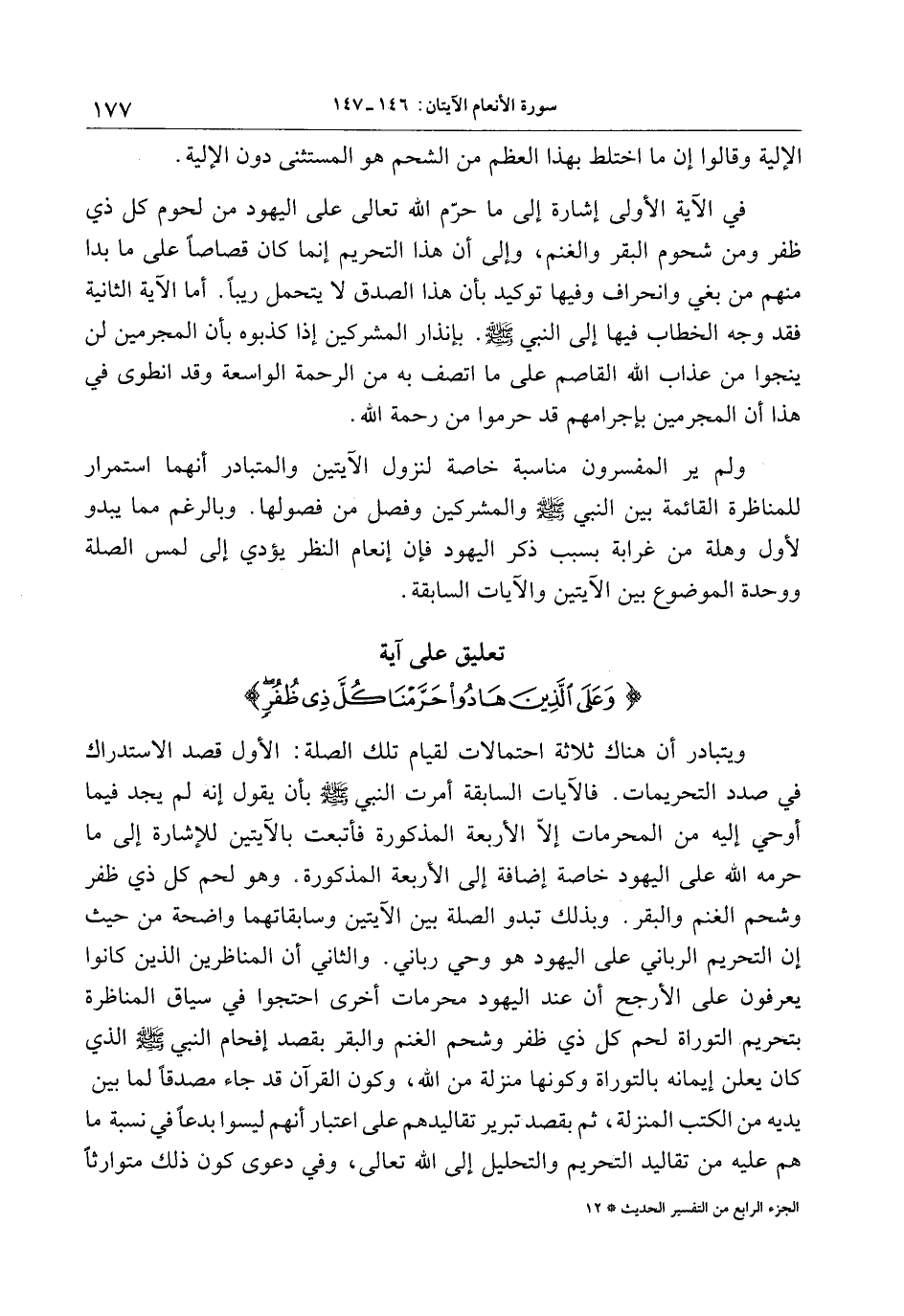 ويتبادر أن هناك ثلاثة احتمالات لقيام تلك الصلة: الأول قصد الاستدراك في صدد التحريمات. فالآيات السابقة أمرت النبي صلى الله عليه وسلم بأن يقول إنه لم يجد فيما أوحي إليه من المحرمات إلّا الأربعة المذكورة فأتبعت بالآيتين للإشارة إلى ما حرمه الله على اليهود خاصة إضافة إلى الأربعة المذكورة. وهو لحم كل ذي ظفر وشحم الغنم والبقر. وبذلك تبدو الصلة بين الآيتين وسابقاتهما واضحة من حيث إن التحريم الرباني على اليهود هو وحي رباني. والثاني أن المناظرين الذين كانوا يعرفون على الأرجح أن عند اليهود محرمات أخرى احتجوا في سياق المناظرة بتحريم التوراة لحم كل ذي ظفر وشحم الغنم والبقر بقصد إفحام النبي صلى الله عليه وسلم الذي كان يعلن إيمانه بالتوراة وكونها منزلة من الله، وكون القرآن قد جاء مصدقا لما بين يديه من الكتب المنزلة، ثم بقصد تبرير تقاليدهم على اعتبار أنهم ليسوا بدعا في نسبة ما هم عليه من تقاليد التحريم والتحليل إلى الله تعالى، وفي دعوى كون ذلك متوارثا الجزء الرابع من التفسير الحديث 12