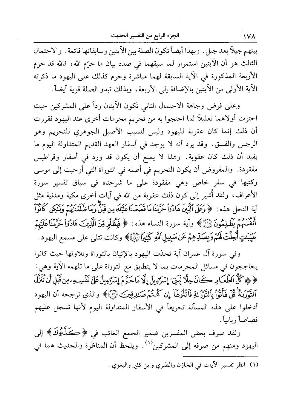 بينهم جيلا بعد جيل. وبهذا أيضا تكون الصلة بين الآيتين وسابقاتها قائمة. والاحتمال الثالث هو أن الآيتين استمرار لما سبقهما في صدد بيان ما حرّم الله، فالله قد حرم الأربعة المذكورة في الآية السابقة لهما مباشرة وحرم كذلك على اليهود ما ذكرته الآية الأولى من الآيتين بالإضافة إلى الأربعة، وبذلك تبدو الصلة قوية أيضا.