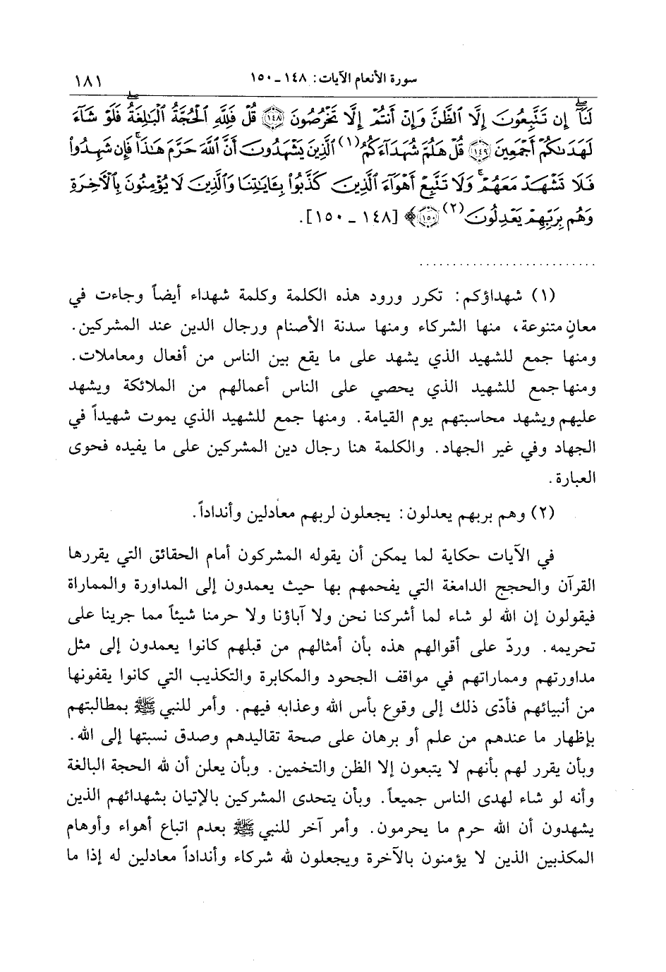(1) شهداؤكم: تكرر ورود هذه الكلمة وكلمة شهداء أيضا وجاءت في معان متنوعة، منها الشركاء ومنها سدنة الأصنام ورجال الدين عند المشركين.