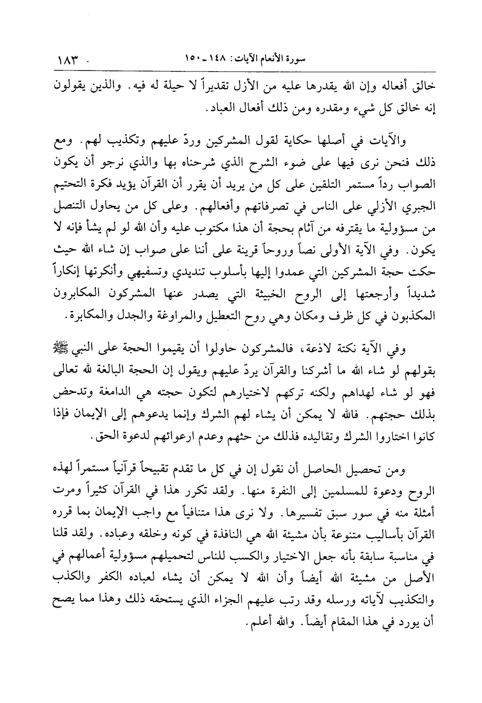 والآيات في أصلها حكاية لقول المشركين وردّ عليهم وتكذيب لهم. ومع ذلك فنحن نرى فيها على ضوء الشرح الذي شرحناه بها والذي نرجو أن يكون الصواب ردا مستمر التلقين على كل من يريد أن يقرر أن القرآن يؤيد فكرة التحتيم الجبري الأزلي على الناس في تصرفاتهم وأفعالهم. وعلى كل من يحاول التنصل من مسؤولية ما يقترفه من آثام بحجة أن هذا مكتوب عليه وأن الله لو لم يشأ فإنه لا يكون. وفي الآية الأولى نصا وروحا قرينة على أننا على صواب إن شاء الله حيث حكت حجة المشركين التي عمدوا إليها بأسلوب تنديدي وتسفيهي وأنكرتها إنكارا شديدا وأرجعتها إلى الروح الخبيثة التي يصدر عنها المشركون المكابرون المكذبون في كل ظرف ومكان وهي روح التعطيل والمراوغة والجدل والمكابرة.