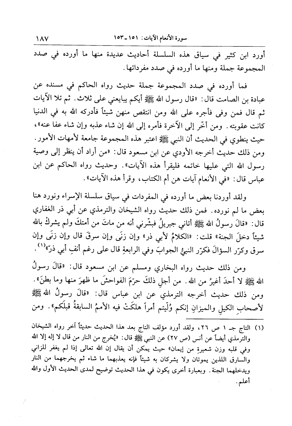 فما أورده في صدد المجموعة جملة حديث رواه الحاكم في مسنده عن عبادة بن الصامت قال: «قال رسول الله صلى الله عليه وسلم أيكم يبايعني على ثلاث. ثم تلا الآيات ثم قال فمن وفى فأجره على الله ومن انتقص منهن شيئا فأدركه الله به في الدنيا كانت عقوبته. ومن أخّر إلى الآخرة فأمره إلى الله إن شاء عذبه وإن شاء عفا عنه» ، حيث ينطوي في الحديث أن النبي صلى الله عليه وسلم اعتبر هذه المجموعة جامعة لأمهات الأمور.