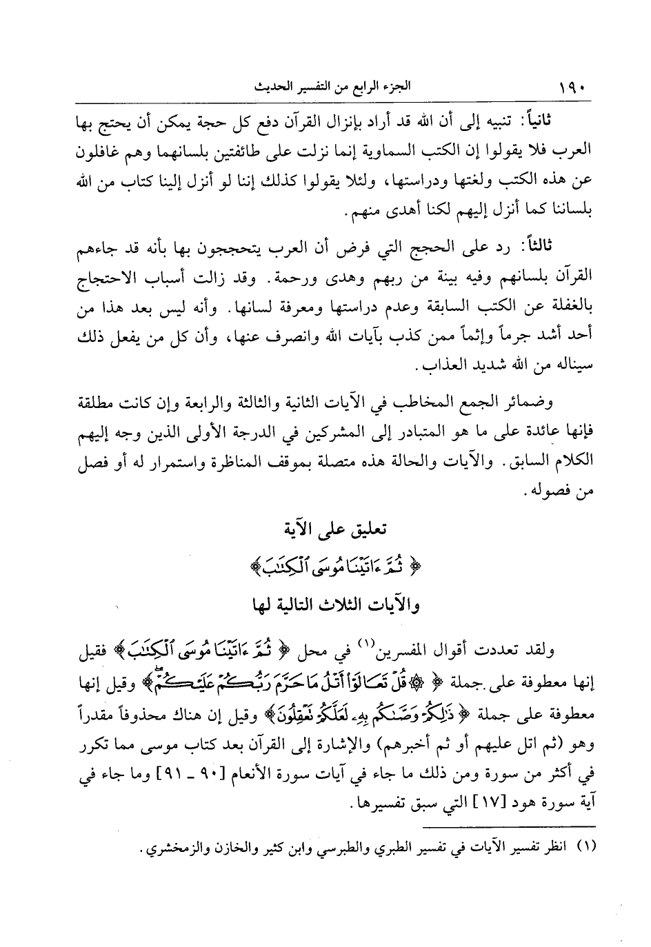 تعليق على الآية ثُمَّ آتَيْنا مُوسَى الْكِتابَ والآيات الثلاث التالية لها