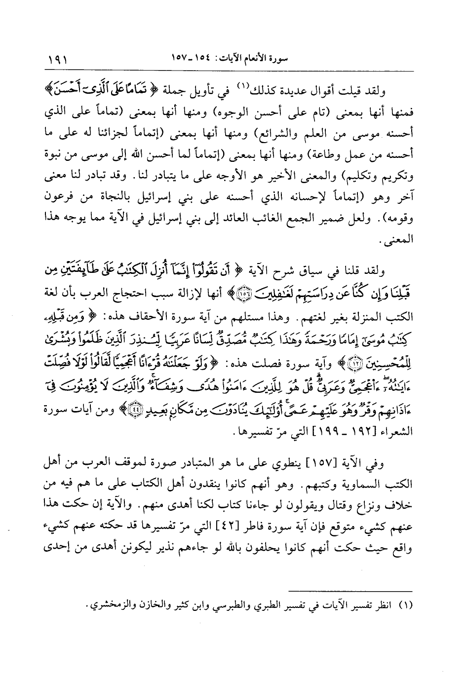 ولقد قيلت أقوال عديدة كذلك «1» في تأويل جملة تَماماً عَلَى الَّذِي أَحْسَنَ فمنها أنها بمعنى (تام على أحسن الوجوه) ومنها أنها بمعنى (تماما على الذي أحسنه موسى من العلم والشرائع) ومنها أنها بمعنى (إتماما لجزائنا له على ما أحسنه من عمل وطاعة) ومنها أنها بمعنى (إتماما لما أحسن الله إلى موسى من نبوة وتكريم وتكليم) والمعنى الأخير هو الأوجه على ما يتبادر لنا. وقد تبادر لنا معنى آخر وهو (إتماما لإحسانه الذي أحسنه على بني إسرائيل بالنجاة من فرعون وقومه) . ولعل ضمير الجمع الغائب العائد إلى بني إسرائيل في الآية مما يوجه هذا المعنى.