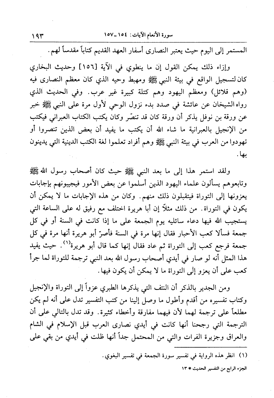 وإزاء ذلك يمكن القول إن ما ينطوي في الآية [156] وحديث البخاري كان لتسجيل الواقع في بيئة النبي صلى الله عليه وسلم ومهبط وحيه الذي كان معظم النصارى فيه (وهم قلائل) ومعظم اليهود وهم كتلة كبيرة غير عرب. وفي الحديث الذي رواه الشيخان عن عائشة في صدد بدء نزول الوحي لأول مرة على النبي صلى الله عليه وسلم خبر عن ورقة بن نوفل يذكر أن ورقة كان قد تنصّر وكان يكتب الكتاب العبراني فيكتب من الإنجيل بالعبرانية ما شاء الله أن يكتب ما يفيد أن بعض الذين تنصروا أو تهودوا من العرب في بيئة النبي صلى الله عليه وسلم وهم أفراد تعلموا لغة الكتب الدينية التي يدينون بها.