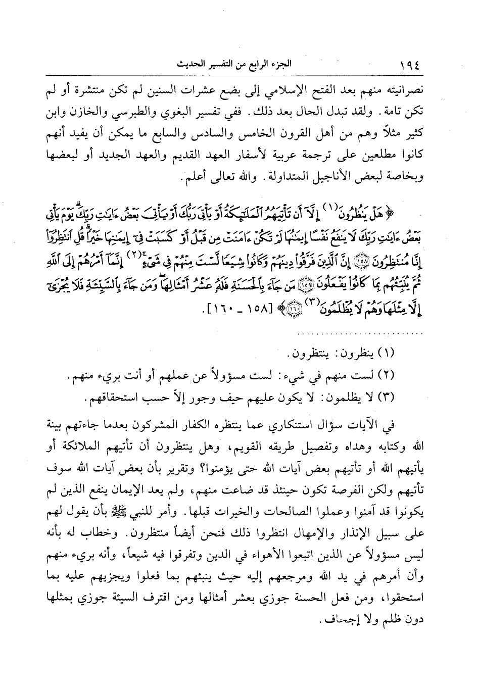 في الآيات سؤال استنكاري عما ينتظره الكفار المشركون بعد ما جاءتهم بينة الله وكتابه وهداه وتفصيل طريقه القويم، وهل ينتظرون أن تأتيهم الملائكة أو يأتيهم الله أو تأتيهم بعض آيات الله حتى يؤمنوا؟ وتقرير بأن بعض آيات الله سوف تأتيهم ولكن الفرصة تكون حينئذ قد ضاعت منهم، ولم يعد الإيمان ينفع الذين لم يكونوا قد آمنوا وعملوا الصالحات والخيرات قبلها. وأمر للنبي صلى الله عليه وسلم بأن يقول لهم على سبيل الإنذار والإمهال انتظروا ذلك فنحن أيضا منتظرون. وخطاب له بأنه ليس مسؤولا عن الذين اتبعوا الأهواء في الدين وتفرقوا فيه شيعا، وأنه بريء منهم وأن أمرهم في يد الله ومرجعهم إليه حيث ينبئهم بما فعلوا ويجزيهم عليه بما استحقوا، ومن فعل الحسنة جوزي بعشر أمثالها ومن اقترف السيئة جوزي بمثلها دون ظلم ولا إجحاف.
