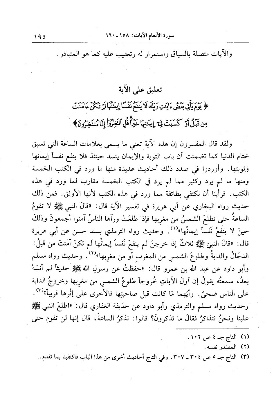 تعليق على الآية يَوْمَ يَأْتِي بَعْضُ آياتِ رَبِّكَ لا يَنْفَعُ نَفْساً إِيمانُها لَمْ تَكُنْ آمَنَتْ مِنْ قَبْلُ أَوْ كَسَبَتْ فِي إِيمانِها خَيْراً قُلِ انْتَظِرُوا إِنَّا مُنْتَظِرُونَ