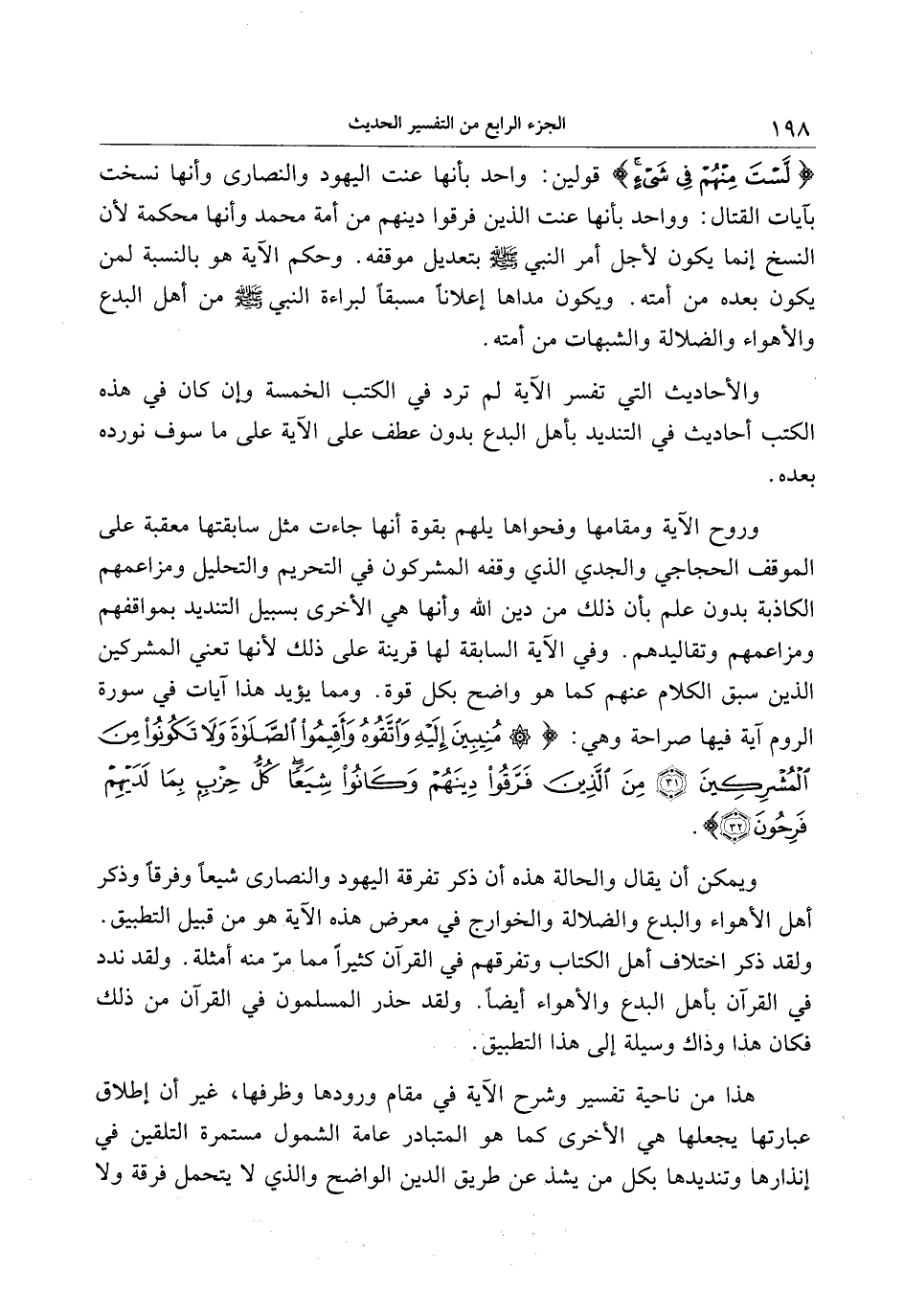 لَسْتَ مِنْهُمْ فِي شَيْءٍ قولين: واحد بأنها عنت اليهود والنصارى وأنها نسخت بآيات القتال: وواحد بأنها عنت الذين فرقوا دينهم من أمة محمد وأنها محكمة لأن النسخ إنما يكون لأجل أمر النبي صلى الله عليه وسلم بتعديل موقفه. وحكم الآية هو بالنسبة لمن يكون بعده من أمته. ويكون مداها إعلانا مسبقا لبراءة النبي صلى الله عليه وسلم من أهل البدع والأهواء والضلالة والشبهات من أمته.