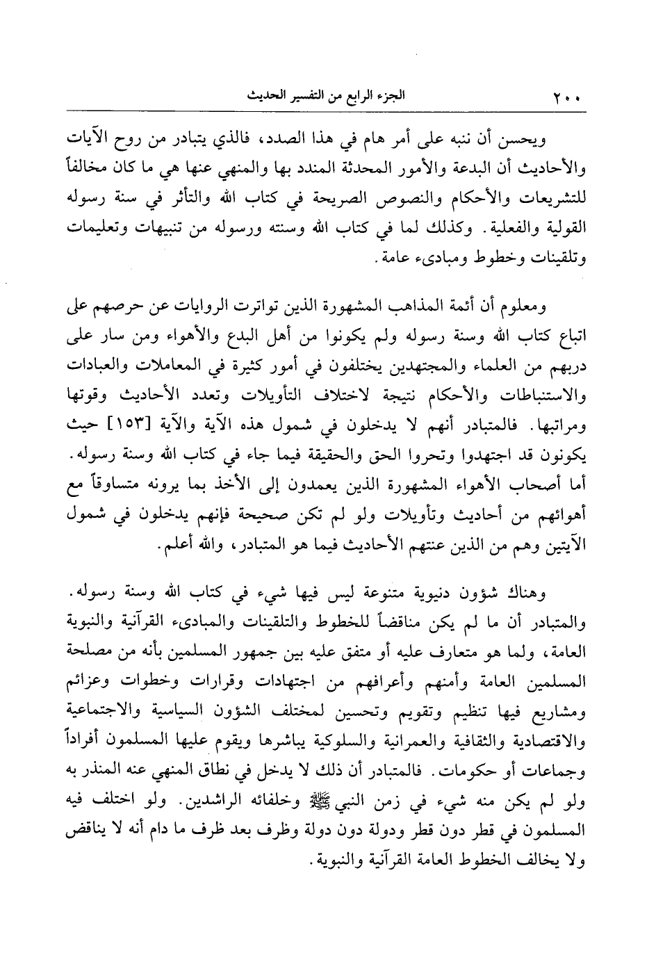 والمتبادر أن ما لم يكن مناقضا للخطوط والتلقينات والمبادئ القرآنية والنبوية العامة، ولما هو متعارف عليه أو متفق عليه بين جمهور المسلمين بأنه من مصلحة المسلمين العامة وأمنهم وأعرافهم من اجتهادات وقرارات وخطوات وعزائم ومشاريع فيها تنظيم وتقويم وتحسين لمختلف الشؤون السياسية والاجتماعية والاقتصادية والثقافية والعمرانية والسلوكية يباشرها ويقوم عليها المسلمون أفرادا وجماعات أو حكومات. فالمتبادر أن ذلك لا يدخل في نطاق المنهي عنه المنذر به ولو يكن منه شيء في زمن النبي صلى الله عليه وسلم وخلفائه الراشدين. ولو اختلف فيه المسلمون في قطر دون قطر ودولة دون دولة وظرف بعد ظرف ما دام أنه لا يناقض ولا يخالف الخطوط العامة القرآنية والنبوية.