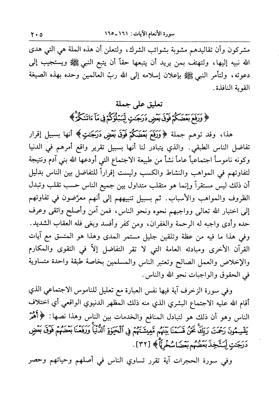 هذا، وقد توهم جملة وَرَفَعَ بَعْضَكُمْ فَوْقَ بَعْضٍ دَرَجاتٍ أنها بسبيل إقرار تفاضل الناس الطبقي. والذي يتبادر لنا أنها بسبيل تقرير واقع أمرهم في الدنيا وكونه ناموسا اجتماعيا عاما نشأ من طبيعة الاجتماع التي أودعها الله بني آدم ونتيجة لتفاوتهم في المواهب والنشاط والكسب وليست إقرارا للتفاضل بين الناس بدليل أن ذلك ليس مستقرا وإنما هو متقلب متداول بين جميع الناس حسب تقلب وتبدل الظروف والمواهب والأسباب. ثم بسبيل تنبيههم إلى أنهم معرّضون في تفاوتهم إلى اختبار الله تعالى وواجبهم نحوه ونحو الناس، فمن آمن وأصلح واتقى وعرف حده وأدى واجبه له الرحمة والغفران، ومن كفر وأفسد وبغى فله العقاب الشديد.