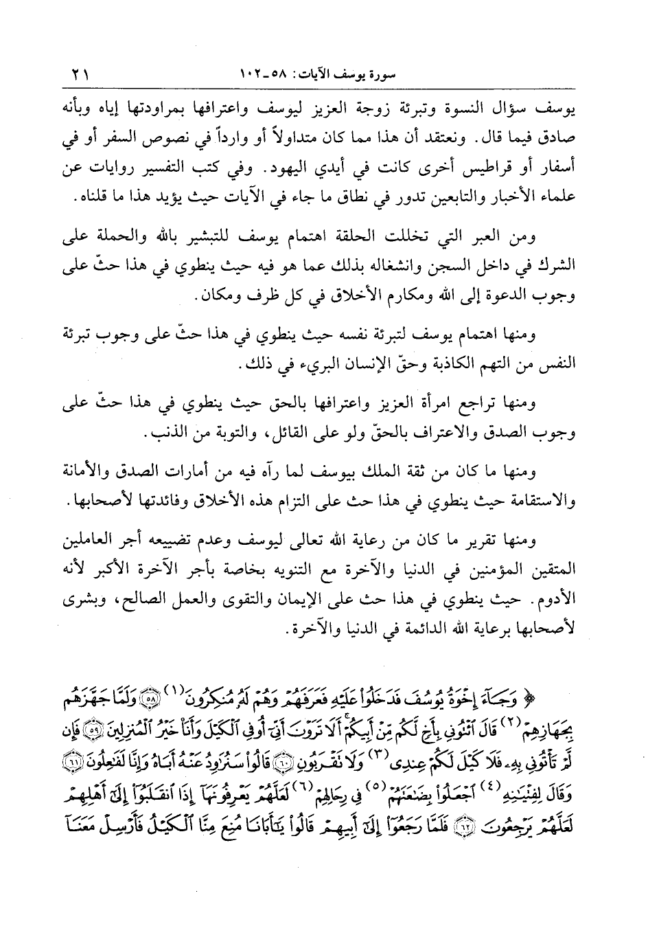 يوسف سؤال النسوة وتبرئة زوجة العزيز ليوسف واعترافها بمراودتها إياه وبأنه صادق فيما قال. ونعتقد أن هذا مما كان متداولا أو واردا في نصوص السفر أو في أسفار أو قراطيس أخرى كانت في أيدي اليهود. وفي كتب التفسير روايات عن علماء الأخبار والتابعين تدور في نطاق ما جاء في الآيات حيث يؤيد هذا ما قلناه.