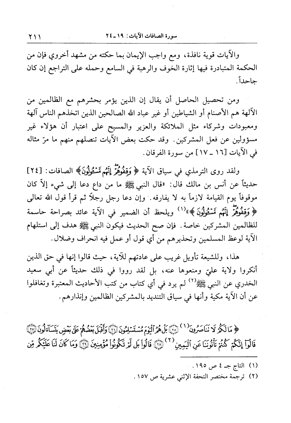 ولقد روى الترمذي في سياق الآية وَقِفُوهُمْ إِنَّهُمْ مَسْؤُلُونَ الصافات: [24] حديثا عن أنس بن مالك قال: «قال النبي صلى الله عليه وسلم ما من داع دعا إلى شيء إلّا كان موقوفا يوم القيامة لازما به لا يفارقه. وإن دعا رجل رجلا ثم قرأ قول الله تعالى وَقِفُوهُمْ إِنَّهُمْ مَسْؤُلُونَ» «1» ويلحظ أن الضمير في الآية عائد بصراحة حاسمة للظالمين المشركين خاصة. فإن صح الحديث فيكون النبي صلى الله عليه وسلم هدف إلى استلهام الآية لوعظ المسلمين وتحذيرهم من أي قول أو عمل فيه انحراف وضلال.