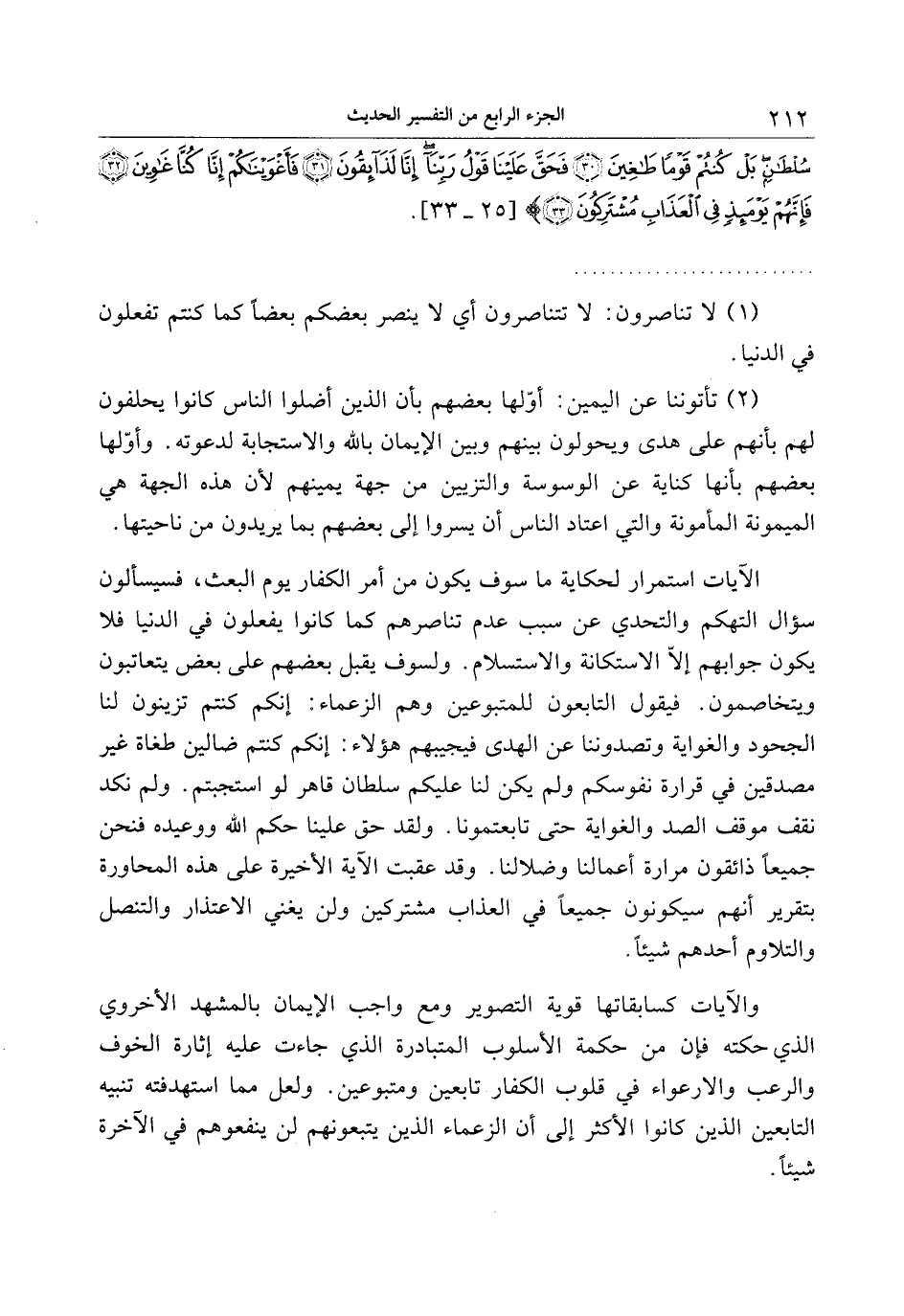 الآيات استمرار لحكاية ما سوف يكون من أمر الكفار يوم البعث، فسيسألون سؤال التهكم والتحدي عن سبب عدم تناصرهم كما كانوا يفعلون في الدنيا فلا يكون جوابهم إلّا الاستكانة والاستسلام. ولسوف يقبل بعضهم على بعض يتعاتبون ويتخاصمون. فيقول التابعون للمتبوعين وهم الزعماء: إنكم كنتم تزينون لنا الجحود والغواية وتصدوننا عن الهدى فيجيبهم هؤلاء: إنكم كنتم ضالين طغاة غير مصدقين في قرارة نفوسكم ولم يكن لنا عليكم سلطان قاهر لو استجبتم. ولم نكد نقف موقف الصد والغواية حتى تابعتمونا. ولقد حق علينا حكم الله ووعيده فنحن جميعا ذائقون مرارة أعمالنا وضلالنا. وقد عقبت الآية الأخيرة على هذه المحاورة بتقرير أنهم سيكونون جميعا في العذاب مشتركين ولن يغني الاعتذار والتنصل والتلاوم أحدهم شيئا.