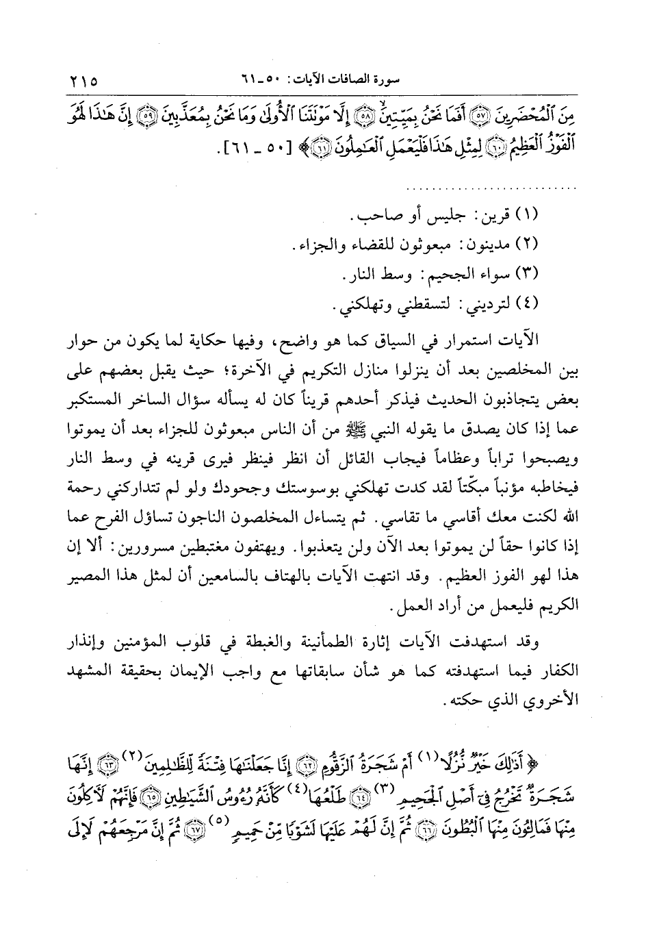 الآيات استمرار في السياق كما هو واضح، وفيها حكاية لما يكون من حوار بين المخلصين بعد أن ينزلوا منازل التكريم في الآخرة حيث يقبل بعضهم على بعض يتجاذبون الحديث فيذكر أحدهم قرينا كان له يسأله سؤال الساخر المستكبر عما إذا كان يصدق ما يقوله النبي صلى الله عليه وسلم من أن الناس مبعوثون للجزاء بعد أن يموتوا ويصبحوا ترابا وعظاما فيجاب القائل أن انظر فينظر فيرى قرينه في وسط النار فيخاطبه مؤنبا مبكّتا لقد كدت تهلكني بوسوستك وجحودك ولو لم تتداركني رحمة الله لكنت معك أقاسي ما تقاسي. ثم يتساءل المخلصون الناجون تساؤل الفرح عما إذا كانوا حقا لن يموتوا بعد الآن ولن يتعذبوا. ويهتفون مغتبطين مسرورين: ألا إن هذا لهو الفوز العظيم. وقد انتهت الآيات بالهتاف بالسامعين أن لمثل هذا المصير الكريم فليعمل من أراد العمل.