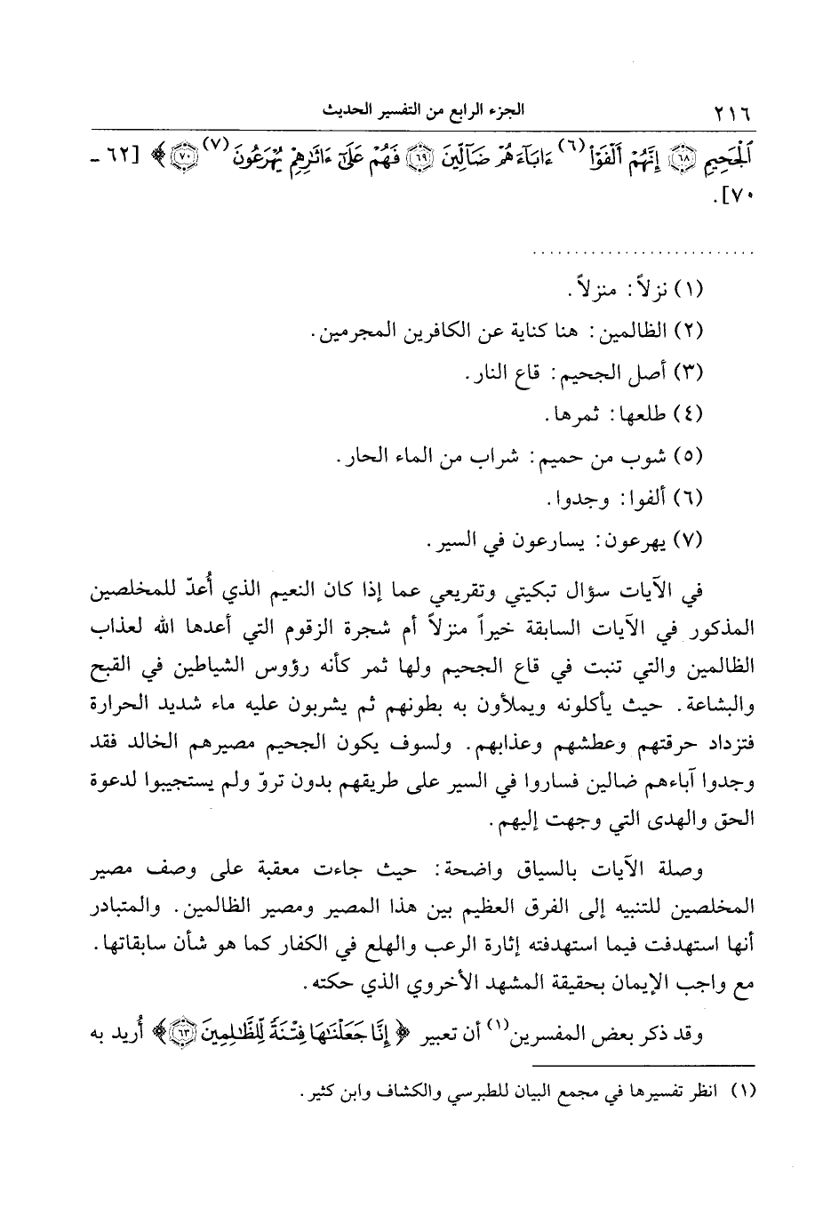 في الآيات سؤال تبكيتي وتقريعي عما إذا كان النعيم الذي أعدّ للمخلصين المذكور في الآيات السابقة خيرا منزلا أم شجرة الزقوم التي أعدها الله لعذاب الظالمين والتي تنبت في قاع الجحيم ولها ثمر كأنه رؤوس الشياطين في القبح والبشاعة. حيث يأكلونه ويملأون به بطونهم ثم يشربون عليه ماء شديد الحرارة فتزداد حرقتهم وعطشهم وعذابهم. ولسوف يكون الجحيم مصيرهم الخالد فقد وجدوا آباءهم ضالين فساروا في السير على طريقهم بدون تروّ ولم يستجيبوا لدعوة الحق والهدى التي وجهت إليهم.