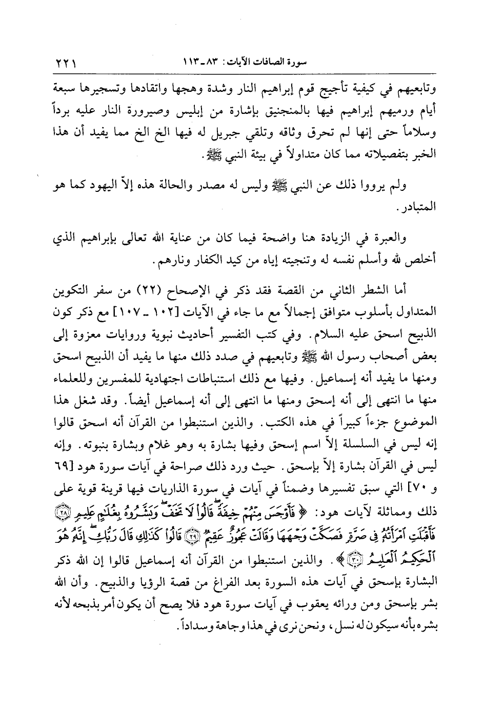 أما الشطر الثاني من القصة فقد ذكر في الإصحاح (22) من سفر التكوين المتداول بأسلوب متوافق إجمالا مع ما جاء في الآيات [102- 107] مع ذكر كون الذبيح اسحق عليه السلام. وفي كتب التفسير أحاديث نبوية وروايات معزوة إلى بعض أصحاب رسول الله صلى الله عليه وسلم وتابعيهم في صدد ذلك منها ما يفيد أن الذبيح اسحق ومنها ما يفيد أنه إسماعيل. وفيها مع ذلك استنباطات اجتهادية للمفسرين وللعلماء منها ما انتهى إلى أنه إسحق ومنها ما انتهى إلى أنه إسماعيل أيضا. وقد شغل هذا الموضوع جزءا كبيرا في هذه الكتب. والذين استنبطوا من القرآن أنه اسحق قالوا إنه ليس في السلسلة إلّا اسم إسحق وفيها بشارة به وهو غلام وبشارة بنبوته. وإنه ليس في القرآن بشارة إلّا بإسحاق. حيث ورد ذلك صراحة في آيات سورة هود [69 و 70] التي سبق تفسيرها وضمنا في آيات في سورة الذاريات فيها قرينة قوية على ذلك ومماثلة لآيات هود: فَأَوْجَسَ مِنْهُمْ خِيفَةً قالُوا لا تَخَفْ وَبَشَّرُوهُ بِغُلامٍ عَلِيمٍ (28) فَأَقْبَلَتِ امْرَأَتُهُ فِي صَرَّةٍ فَصَكَّتْ وَجْهَها وَقالَتْ عَجُوزٌ عَقِيمٌ (29) قالُوا كَذلِكَ قالَ رَبُّكِ إِنَّهُ هُوَ الْحَكِيمُ الْعَلِيمُ (30) . والذين استنبطوا من القرآن أنه إسماعيل قالوا إن الله ذكر البشارة بإسحاق في آيات هذه السورة بعد الفراغ من قصة الرؤيا والذبيح. وأن الله بشر بإسحاق ومن ورائه يعقوب في آيات سورة هود فلا يصح أن يكون أمر بذبحه لأنه بشره بأنه سيكون له نسل، ونحن نرى في هذا وجاهة وسدادا.