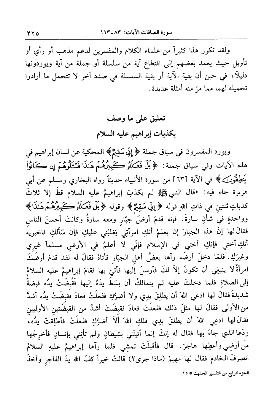 ويورد المفسرون في سياق جملة إِنِّي سَقِيمٌ المحكية عن لسان إبراهيم في هذه الآيات وفي سياق جملة: بَلْ فَعَلَهُ كَبِيرُهُمْ هذا فَسْئَلُوهُمْ إِنْ كانُوا يَنْطِقُونَ في الآية [63] من سورة الأنبياء حديثا رواه البخاري ومسلم عن أبي هريرة جاء فيه: «قال النبي صلى الله عليه وسلم لم يكذب إبراهيم عليه السلام قطّ إلا ثلاث كذبات ثنتين في ذات الله قوله إِنِّي سَقِيمٌ وقوله بَلْ فَعَلَهُ كَبِيرُهُمْ هذا وواحدة في شأن سارة. فإنه قدم أرض جبّار ومعه سارة وكانت أحسن الناس فقال لها إنّ هذا الجبار إن يعلم أنك امرأتي يغلبني عليك فإن سألك فاخبريه أنك أختي فإنك أختي في الإسلام فإنّي لا أعلم في الأرض مسلما غيري وغيرك. فلمّا دخل أرضه رآها بعض أهل الجبّار فأتاه فقال له لقد قدم أرضك امرأة لا ينبغي أن تكون إلّا لك فأرسل إليها فأتي بها فقام إبراهيم عليه السلام إلى الصلاة فلما دخلت عليه لم يتمالك أن بسط يده إليها فقبضت يده قبضة شديدة فقال لها ادعي الله أن يطلق يدي ولا أضرّك ففعلت فعاد فقبضت يده أشدّ من الأولى فقال لها مثل ذلك ففعلت فعاد فقبضت أشدّ من القبضتين الأوليين فقال لها ادعي الله أن يطلق يدي فلك الله ألّا أضرّك ففعلت فأطلقت يده، ودعا الذي جاء بها فقال له إنك إنما أتيتني بشيطان ولم تأتني بإنسان فأخرجها من أرضي وأعطها هاجر. قال فأقبلت تمشي فلما رآها إبراهيم عليه السلام انصرف الخادم فقال لها مهيم (ماذا جرى؟) قالت خيرا كفّ الله يد الفاجر وأخذ الجزء الرابع من التفسير الحديث 15