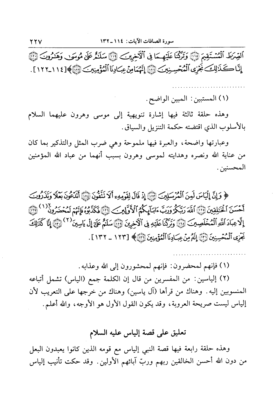 (2) إلياسين: من المفسرين من قال إن الكلمة جمع (الياس) تشمل أتباعه المنسوبين إليه. وهناك من قرأها (آل ياسين) وهناك من خرجها على التعريب لأن إلياس ليست صريحة العروبة، وقد يكون القول الأول هو الأوجه، والله أعلم.