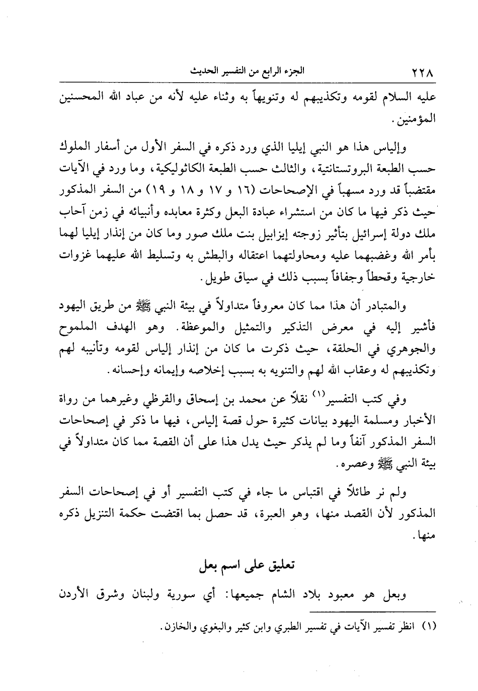وفي كتب التفسير «1» نقلا عن محمد بن إسحاق والقرظي وغيرهما من رواة الأخبار ومسلمة اليهود بيانات كثيرة حول قصة إلياس، فيها ما ذكر في إصحاحات السفر المذكور آنفا وما لم يذكر حيث يدل هذا على أن القصة مما كان متداولا في بيئة النبي صلّى الله عليه وسلم وعصره.