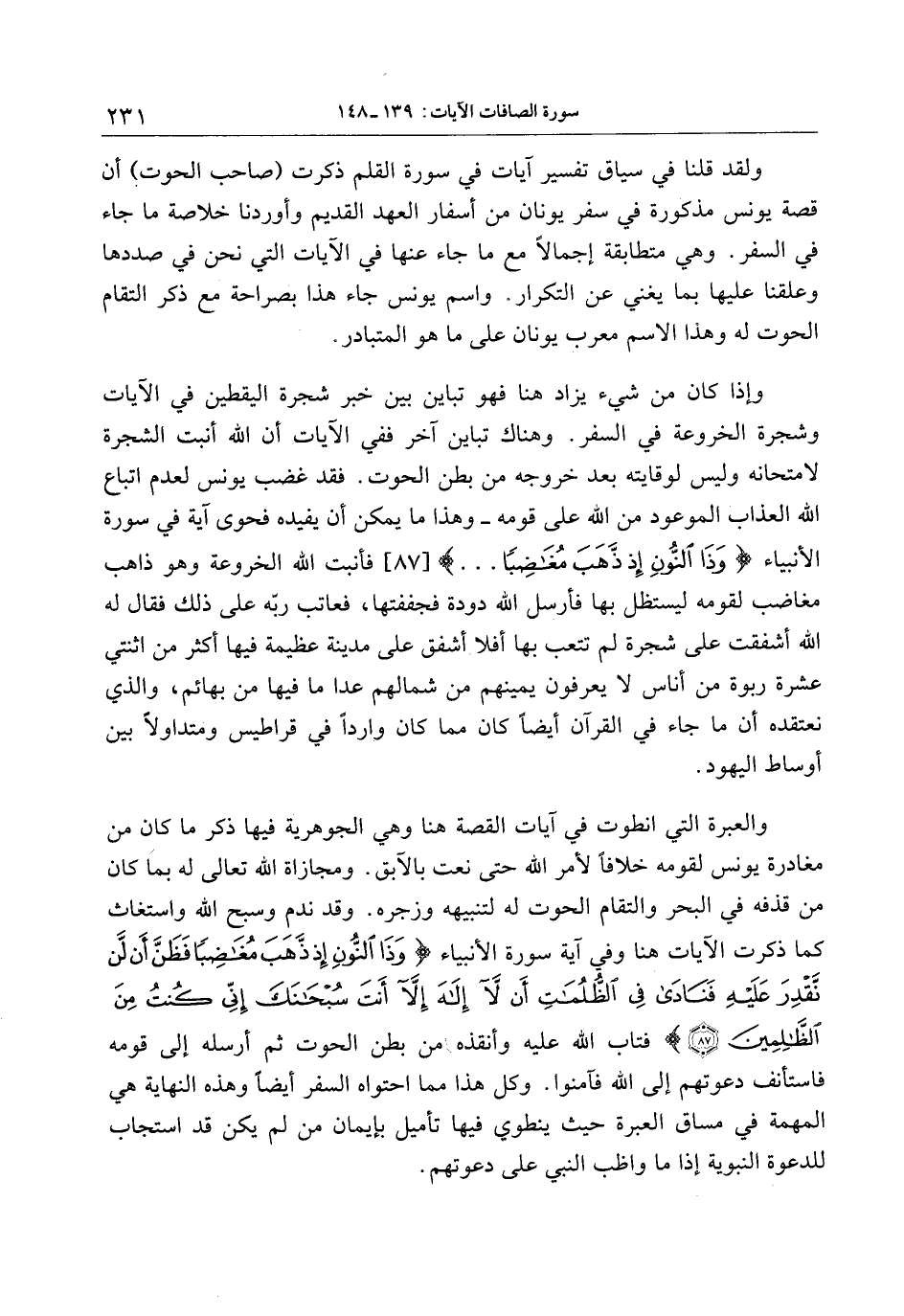 ولقد قلنا في سياق تفسير آيات في سورة القلم ذكرت (صاحب الحوت) أن قصة يونس مذكورة في سفر يونان من أسفار العهد القديم وأوردنا خلاصة ما جاء في السفر. وهي متطابقة إجمالا مع ما جاء عنها في الآيات التي نحن في صددها وعلقنا عليها بما يغني عن التكرار. واسم يونس جاء هذا بصراحة مع ذكر التقام الحوت له وهذا الاسم معرب يونان على ما هو المتبادر.