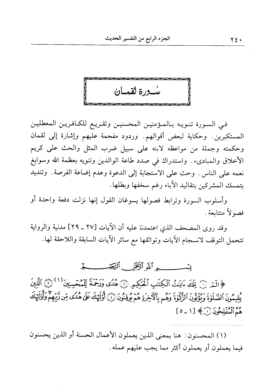 الم (1) تِلْكَ آياتُ الْكِتابِ الْحَكِيمِ (2) هُدىً وَرَحْمَةً لِلْمُحْسِنِينَ (3) الَّذِينَ يُقِيمُونَ الصَّلاةَ وَيُؤْتُونَ الزَّكاةَ وَهُمْ بِالْآخِرَةِ هُمْ يُوقِنُونَ (4)